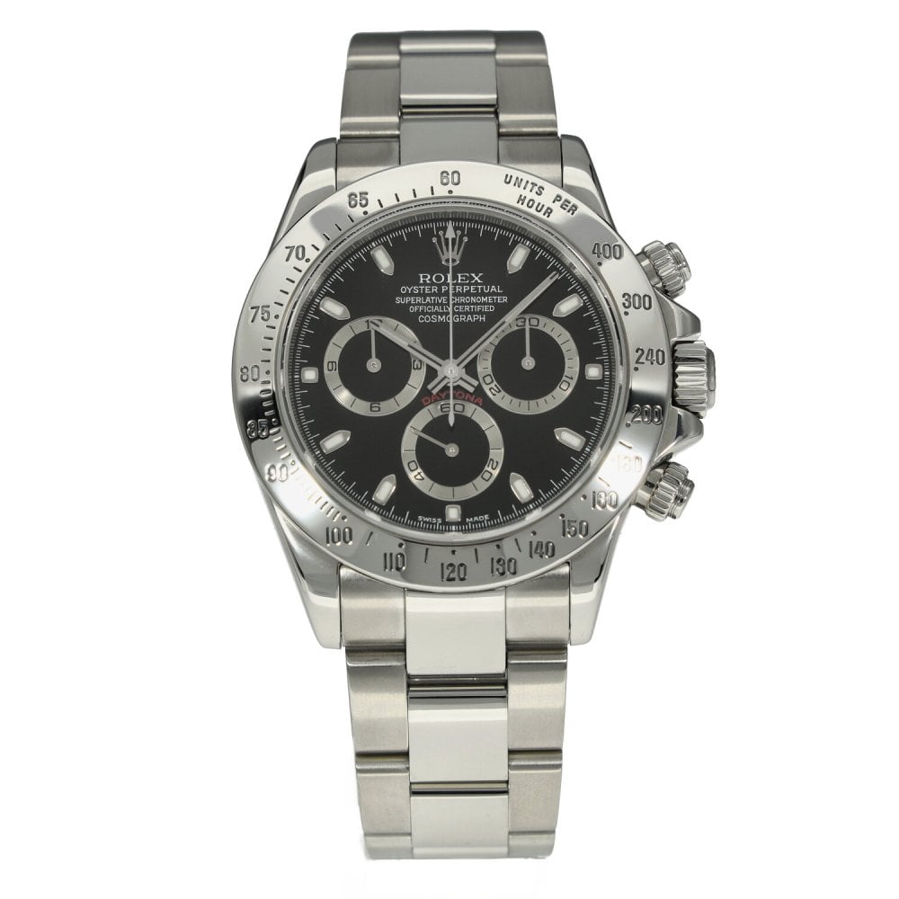 This Rolex Daytona 116520 has a black dial and a bracelet strap. This Rolex has undergone a thorough inspection of water resistance, accuracy, functionality and condition to determine the level of reconditioning required to meet our strict standards. It has also been referenced against technical documents and manufacturer records where available to ensure authenticity and a clean history. All our watches have a 24-month warranty for your peace of mind. One of our skilled polishing technicians has removed marks on the case and bracelet of this watch, brought about by daily wear and tear, which is why this watch does not come with the remaining manufacturer’s warranty.