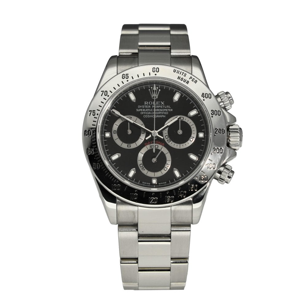 This Rolex Daytona 116520 has a black dial and a bracelet strap. This Rolex has undergone a thorough inspection of water resistance, accuracy, functionality and condition to determine the level of reconditioning required to meet our strict standards. It has also been referenced against technical documents and manufacturer records where available to ensure authenticity and a clean history. All our watches have a 24-month warranty for your peace of mind. One of our skilled polishing technicians has removed marks on the case and bracelet of this watch, brought about by daily wear and tear, which is why this watch does not come with the remaining manufacturer’s warranty.