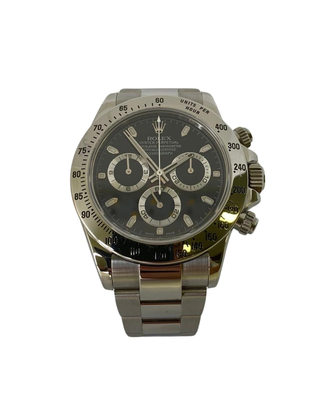 This Rolex Daytona 116520 has a black dial and a bracelet strap. This Rolex has undergone a thorough inspection of water resistance, accuracy, functionality and condition to determine the level of reconditioning required to meet our strict standards. It has also been referenced against technical documents and manufacturer records where available to ensure authenticity and a clean history. All our watches have a 24-month warranty for your peace of mind. One of our skilled polishing technicians has removed marks on the case and bracelet of this watch, brought about by daily wear and tear, which is why this watch does not come with the remaining manufacturer’s warranty.