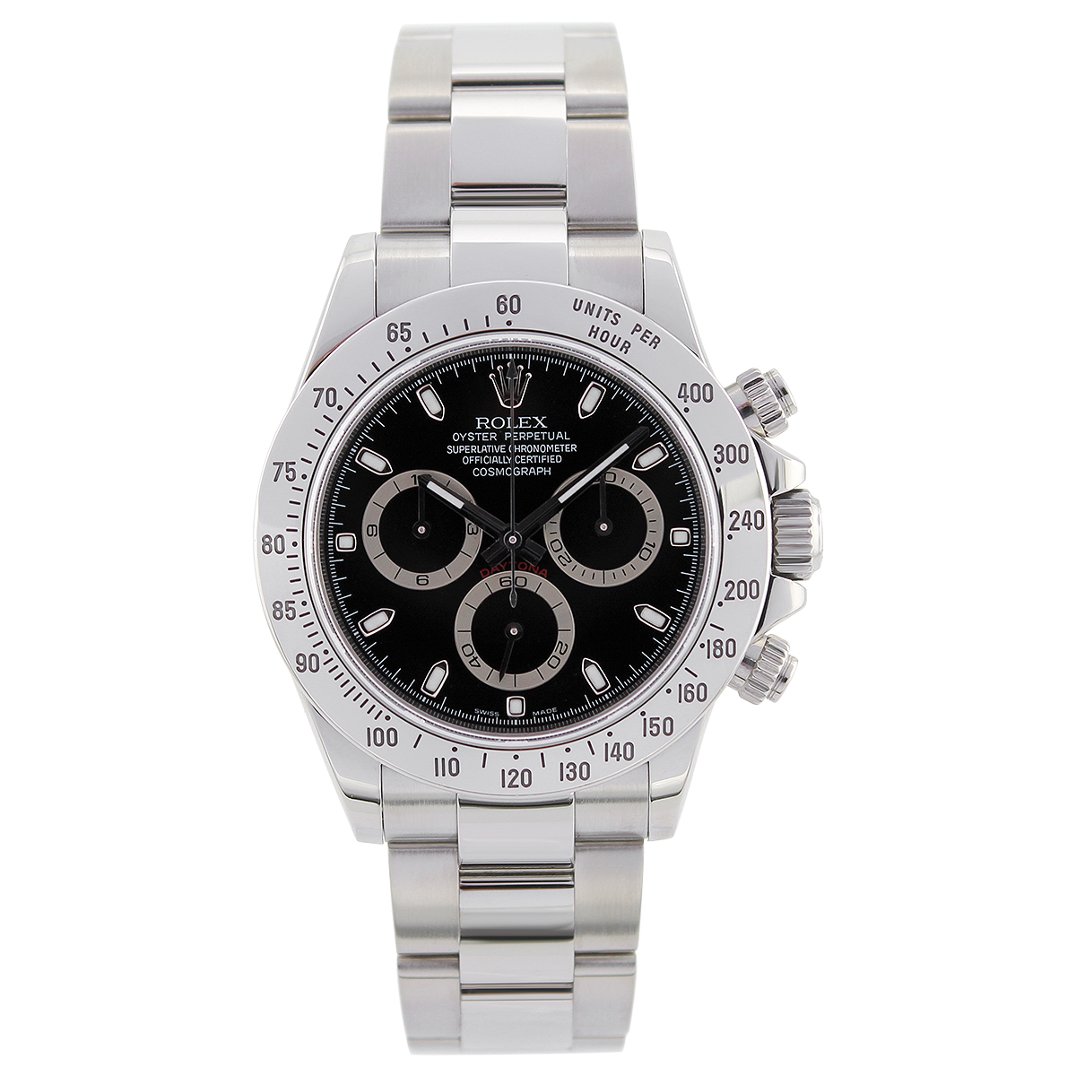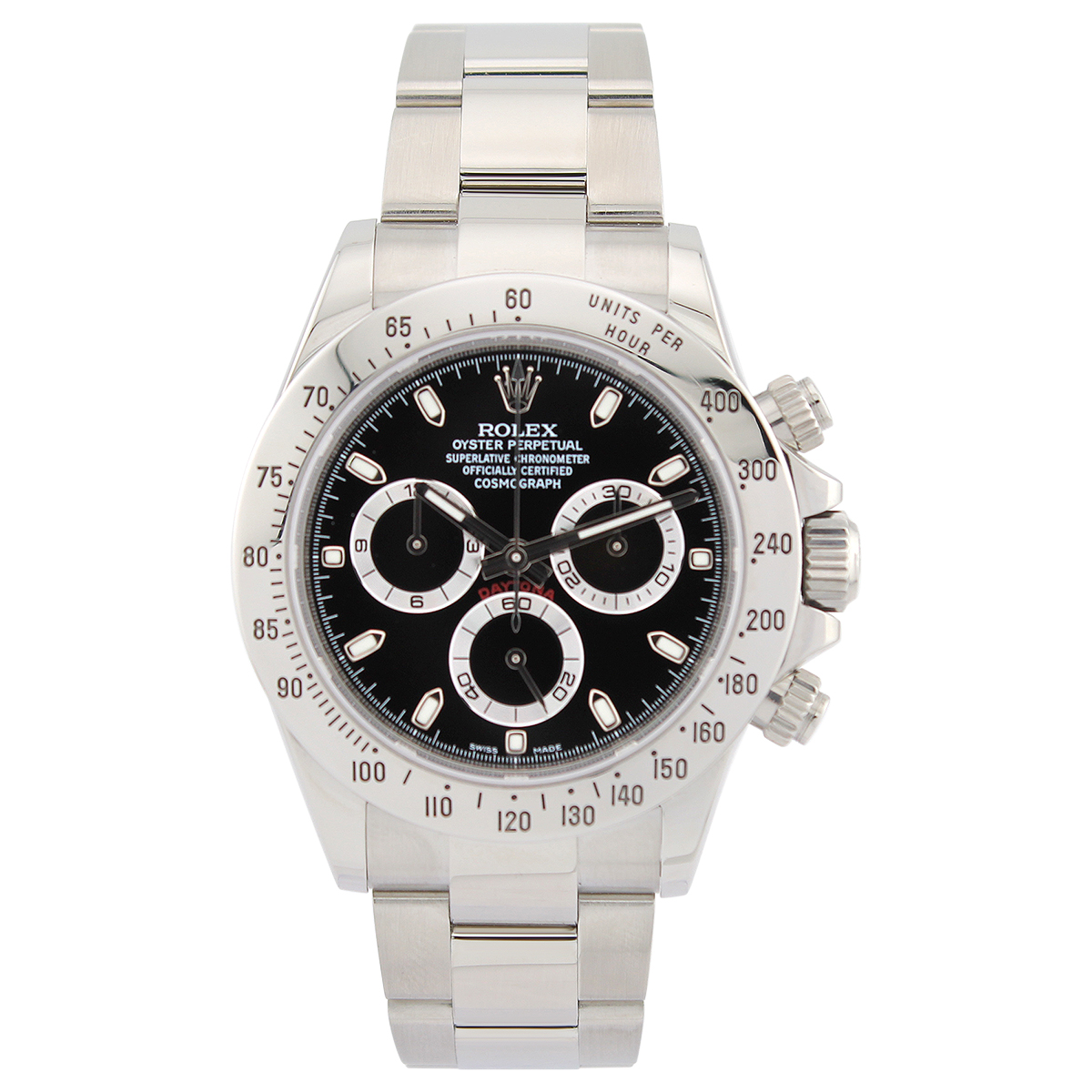 This Rolex Daytona 116520 has a black dial and a bracelet strap. This Rolex has undergone a thorough inspection of water resistance, accuracy, functionality and condition to determine the level of reconditioning required to meet our strict standards. It has also been referenced against technical documents and manufacturer records where available to ensure authenticity and a clean history. All our watches have a 24-month warranty for your peace of mind. One of our skilled polishing technicians has removed marks on the case and bracelet of this watch, brought about by daily wear and tear, which is why this watch does not come with the remaining manufacturer’s warranty.