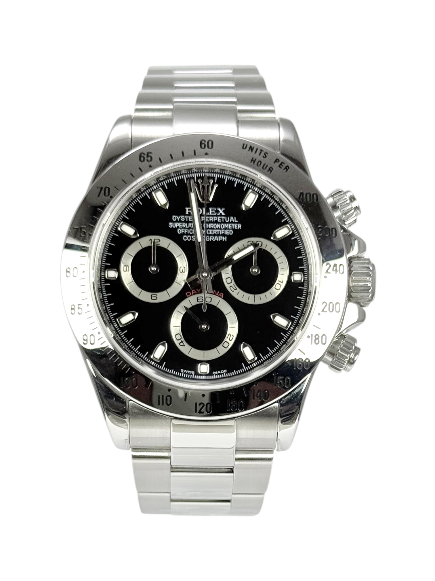 This Rolex Daytona 116520 has a black dial and a bracelet strap. This Rolex has undergone a thorough inspection of water resistance, accuracy, functionality and condition to determine the level of reconditioning required to meet our strict standards. It has also been referenced against technical documents and manufacturer records where available to ensure authenticity and a clean history. Our watches have a 24-month warranty for your peace of mind, in conjunction with any remaining manufacturer’s warranty from new or from service. To maintain the manufacturer’s warranty on this watch, it has not been polished in our service centre.