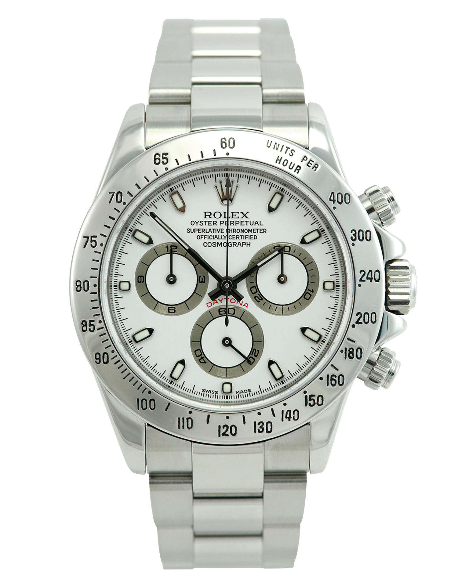 This Rolex Daytona 116520 has a white dial and a bracelet strap. This Rolex has undergone a thorough inspection of water resistance, accuracy, functionality and condition to determine the level of reconditioning required to meet our strict standards. It has also been referenced against technical documents and manufacturer records where available to ensure authenticity and a clean history. All our watches have a 24-month warranty for your peace of mind. One of our skilled polishing technicians has removed marks on the case and bracelet of this watch, brought about by daily wear and tear, which is why this watch does not come with the remaining manufacturer’s warranty.