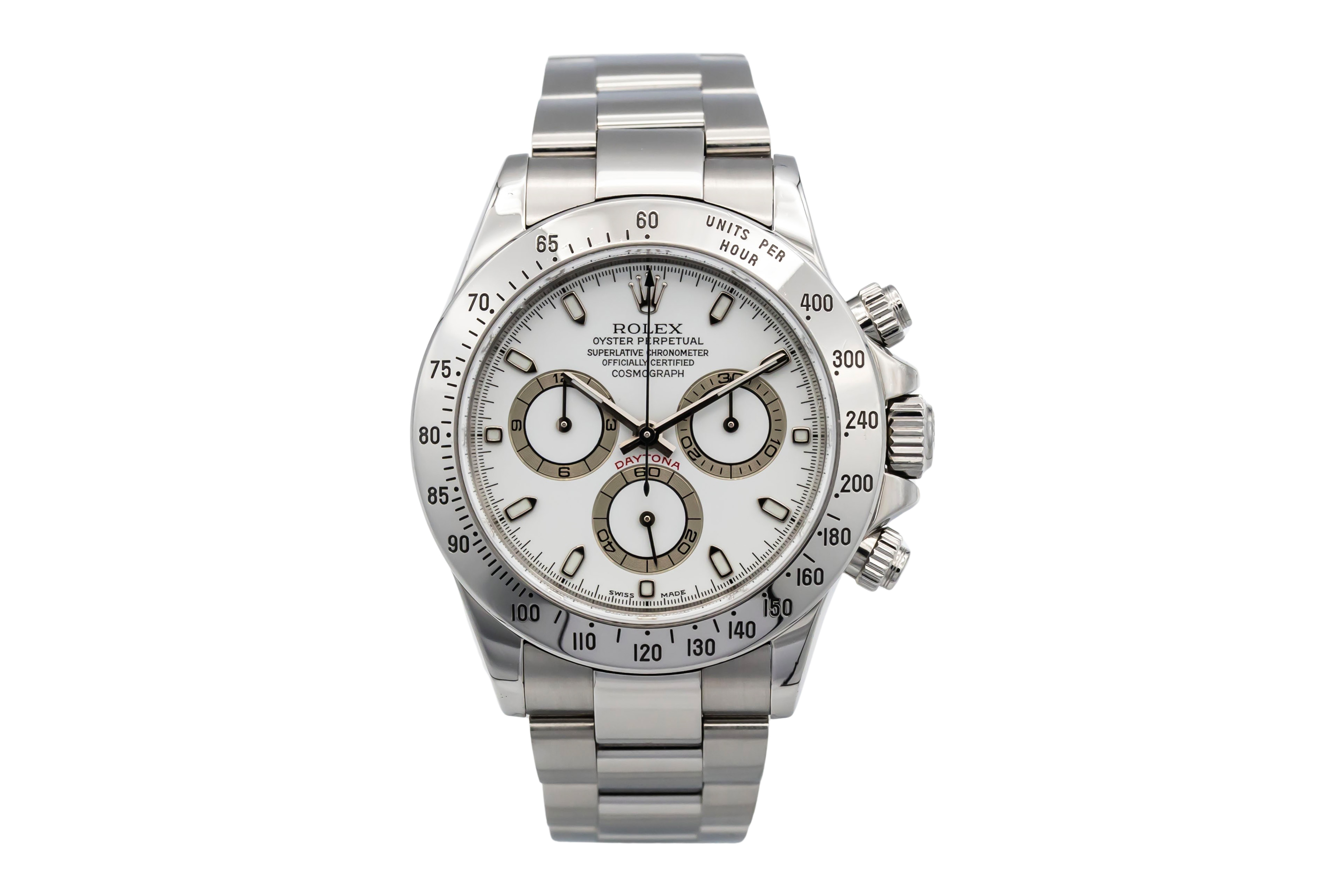 This Rolex Daytona 116520 has a white dial and a bracelet strap. This Rolex has undergone a thorough inspection of water resistance, accuracy, functionality and condition to determine the level of reconditioning required to meet our strict standards. It has also been referenced against technical documents and manufacturer records where available to ensure authenticity and a clean history. All our watches have a 24-month warranty for your peace of mind. One of our skilled polishing technicians has removed marks on the case and bracelet of this watch, brought about by daily wear and tear, which is why this watch does not come with the remaining manufacturer’s warranty.