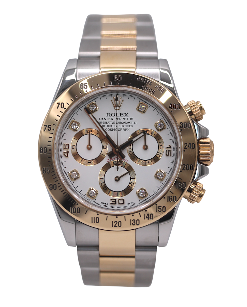 This Rolex Daytona 116523 has a white diamond dial and a bracelet strap. This Rolex has undergone a thorough inspection of water resistance, accuracy, functionality and condition to determine the level of reconditioning required to meet our strict standards. It has also been referenced against technical documents and manufacturer records where available to ensure authenticity and a clean history. All our watches have a 24-month warranty for your peace of mind. One of our skilled polishing technicians has removed marks on the case and bracelet of this watch, brought about by daily wear and tear, which is why this watch does not come with the remaining manufacturer’s warranty.