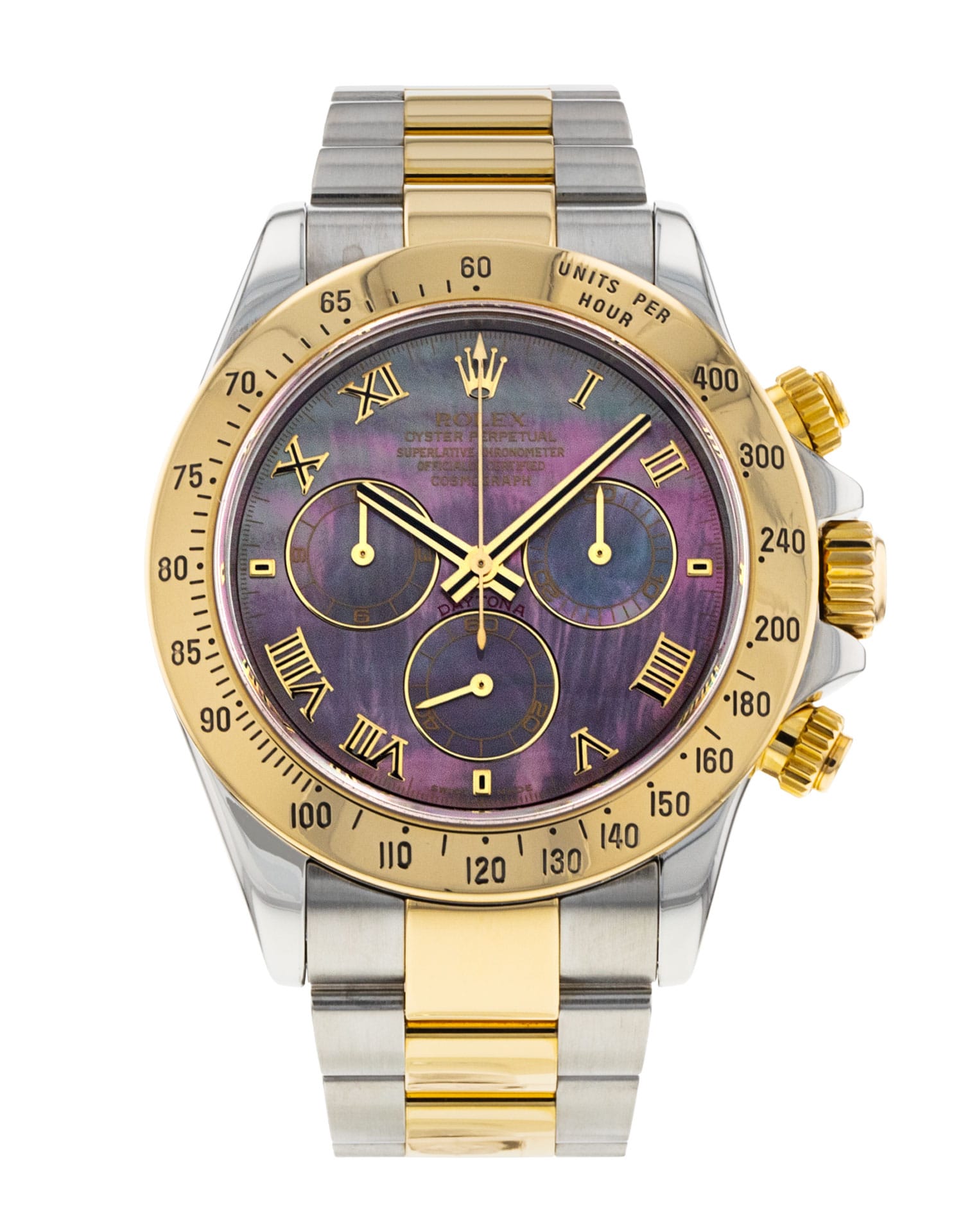 This Rolex Daytona 116523 has a mother of pearl - black roman numeral dial and a bracelet strap. This Rolex has undergone a thorough inspection of water resistance, accuracy, functionality and condition to determine the level of reconditioning required to meet our strict standards. It has also been referenced against technical documents and manufacturer records where available to ensure authenticity and a clean history. All our watches have a 24-month warranty for your peace of mind. One of our skilled polishing technicians has removed marks on the case and bracelet of this watch, brought about by daily wear and tear, which is why this watch does not come with the remaining manufacturer’s warranty.