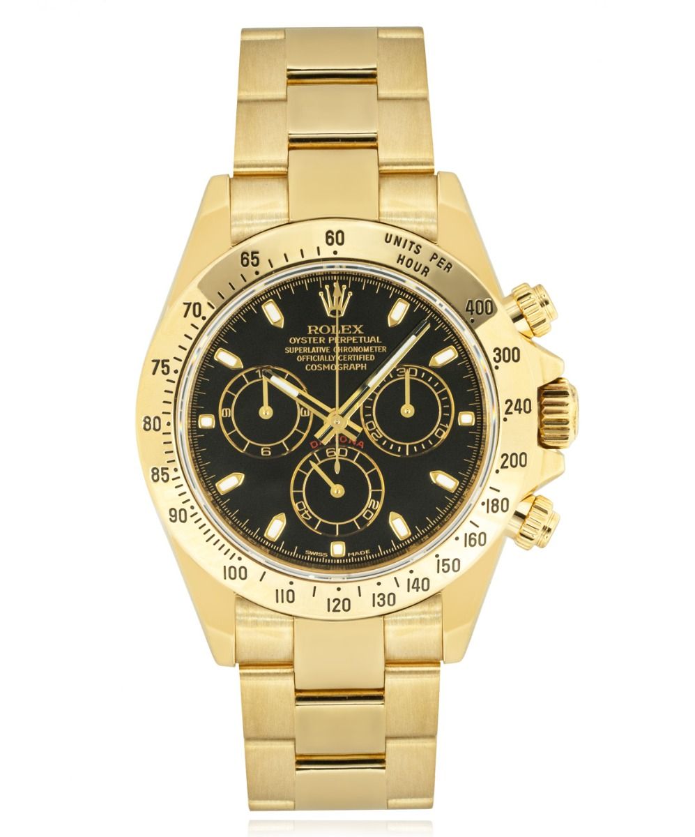 This Rolex Daytona 116528 has a black baton dial and a bracelet strap. This Rolex has undergone a thorough inspection of water resistance, accuracy, functionality and condition to determine the level of reconditioning required to meet our strict standards. It has also been referenced against technical documents and manufacturer records where available to ensure authenticity and a clean history. All our watches have a 24-month warranty for your peace of mind. One of our skilled polishing technicians has removed marks on the case and bracelet of this watch, brought about by daily wear and tear, which is why this watch does not come with the remaining manufacturer’s warranty.