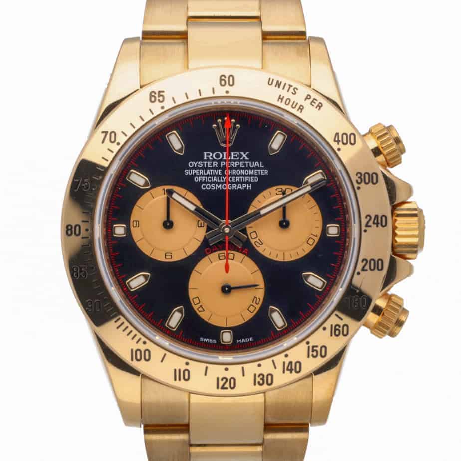 This Rolex Daytona 116528 has a black baton dial and a bracelet strap. This Rolex has undergone a thorough inspection of water resistance, accuracy, functionality and condition to determine the level of reconditioning required to meet our strict standards. It has also been referenced against technical documents and manufacturer records where available to ensure authenticity and a clean history. All our watches have a 24-month warranty for your peace of mind. One of our skilled polishing technicians has removed marks on the case and bracelet of this watch, brought about by daily wear and tear, which is why this watch does not come with the remaining manufacturer’s warranty.