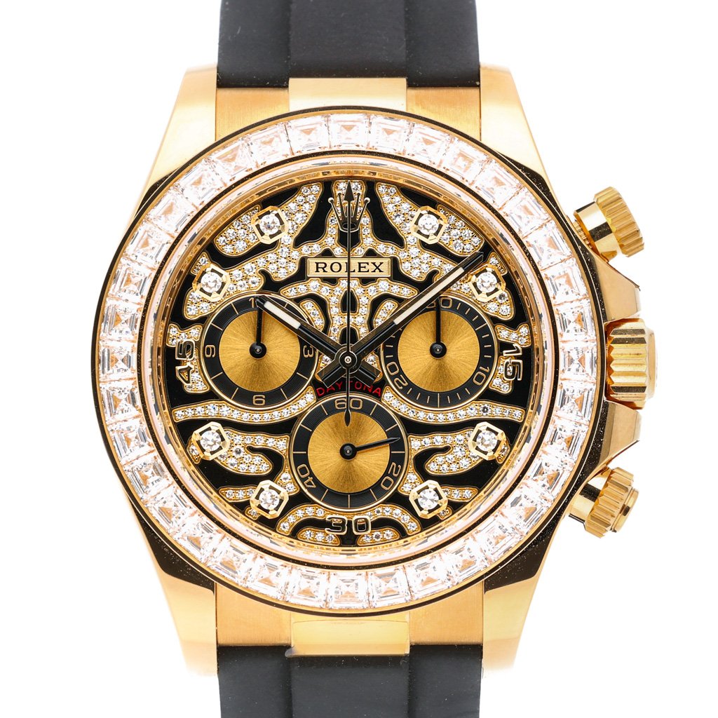 This Rolex Daytona 116588 TBR has a tiger diamond dial and a rubber strap. This Rolex has undergone a thorough inspection of water resistance, accuracy, functionality and condition to determine the level of reconditioning required to meet our strict standards. It has also been referenced against technical documents and manufacturer records where available to ensure authenticity and a clean history. All our watches have a 24-month warranty for your peace of mind. One of our skilled polishing technicians has removed marks on the case and bracelet of this watch, brought about by daily wear and tear, which is why this watch does not come with the remaining manufacturer’s warranty.