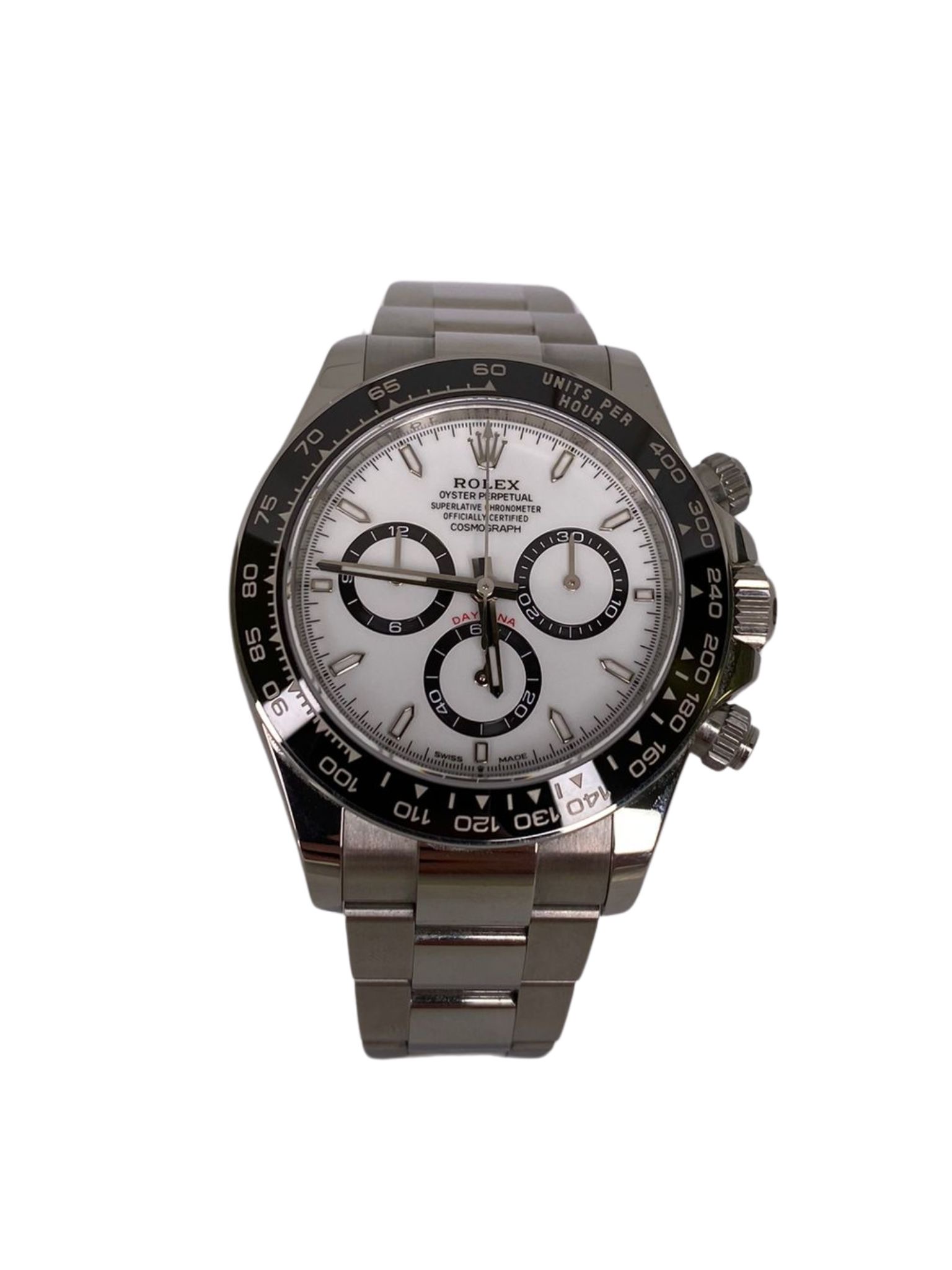 This Rolex Daytona 126500 LN has a white dial and a bracelet strap. This Rolex has undergone a thorough inspection of water resistance, accuracy, functionality and condition to determine the level of reconditioning required to meet our strict standards. It has also been referenced against technical documents and manufacturer records where available to ensure authenticity and a clean history. Our watches have a 24-month warranty for your peace of mind, in conjunction with any remaining manufacturer’s warranty from new or from service. To maintain the manufacturer’s warranty on this watch, it has not been polished in our service centre.