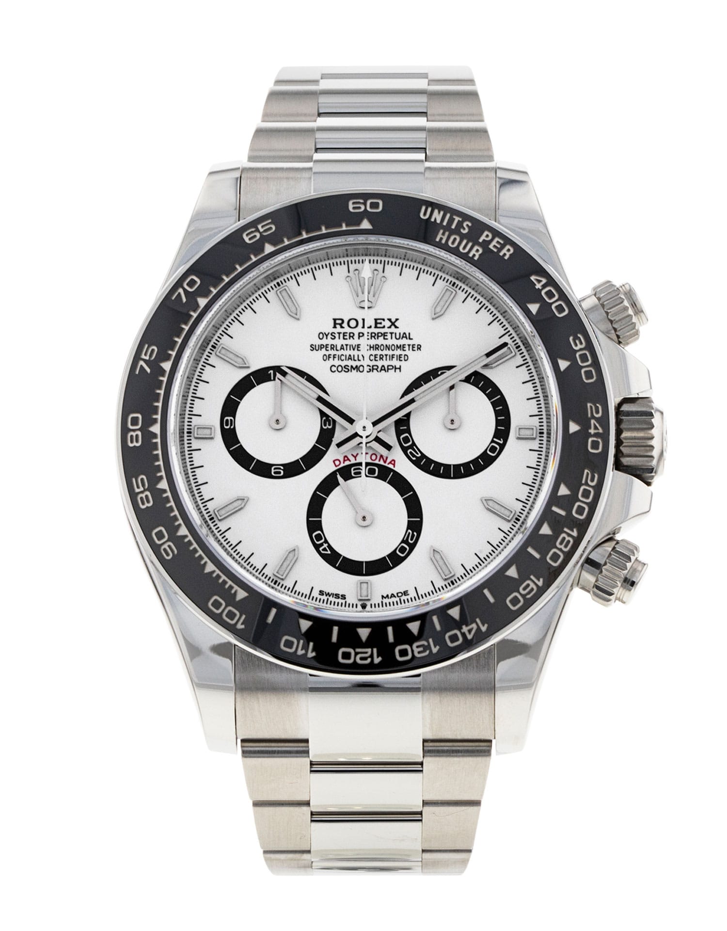 This Rolex Daytona 126500 LN has a white dial and a bracelet strap. This Rolex has undergone a thorough inspection of water resistance, accuracy, functionality and condition to determine the level of reconditioning required to meet our strict standards. It has also been referenced against technical documents and manufacturer records where available to ensure authenticity and a clean history. Our watches have a 24-month warranty for your peace of mind, in conjunction with any remaining manufacturer’s warranty from new or from service. To maintain the manufacturer’s warranty on this watch, it has not been polished in our service centre.