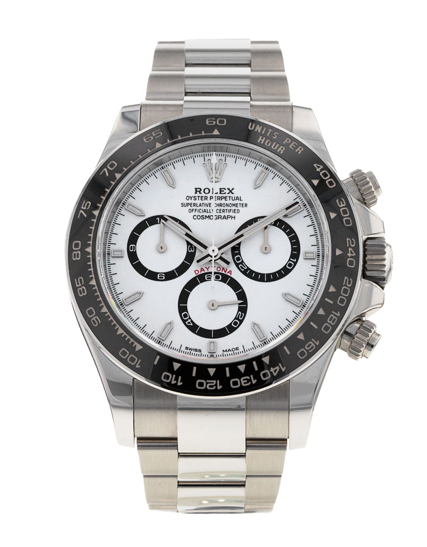 This Rolex Daytona 126500 LN has a white dial and a bracelet strap. This Rolex has undergone a thorough inspection of water resistance, accuracy, functionality and condition to determine the level of reconditioning required to meet our strict standards. It has also been referenced against technical documents and manufacturer records where available to ensure authenticity and a clean history. Our watches have a 24-month warranty for your peace of mind, in conjunction with any remaining manufacturer’s warranty from new or from service. To maintain the manufacturer’s warranty on this watch, it has not been polished in our service centre.