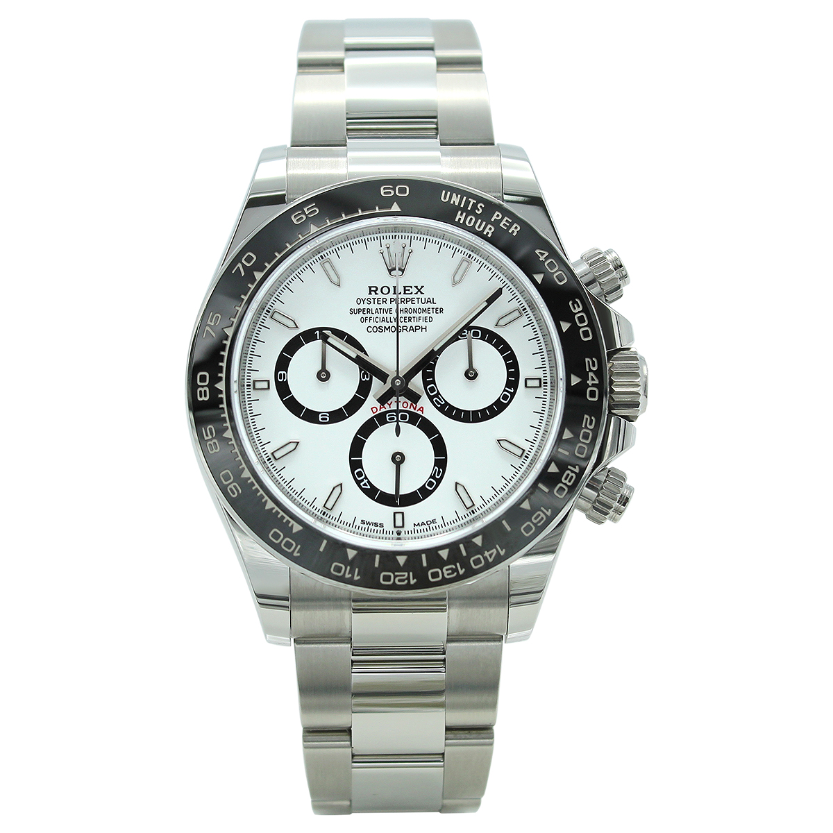This Rolex Daytona 126500 LN has a white dial and a bracelet strap. This Rolex has undergone a thorough inspection of water resistance, accuracy, functionality and condition to determine the level of reconditioning required to meet our strict standards. It has also been referenced against technical documents and manufacturer records where available to ensure authenticity and a clean history. Our watches have a 24-month warranty for your peace of mind, in conjunction with any remaining manufacturer’s warranty from new or from service. To maintain the manufacturer’s warranty on this watch, it has not been polished in our service centre.