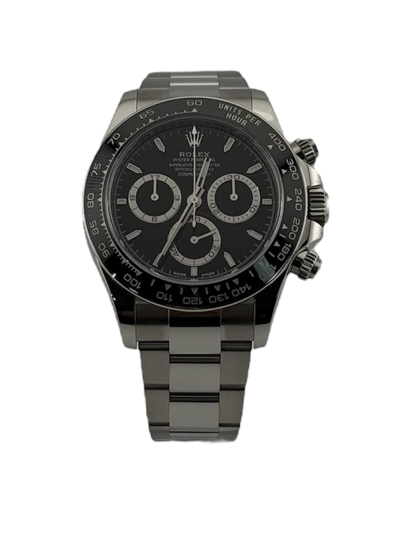 This Rolex Daytona 126500 LN has a black dial and a bracelet strap. This Rolex has undergone a thorough inspection of water resistance, accuracy, functionality and condition to determine the level of reconditioning required to meet our strict standards. It has also been referenced against technical documents and manufacturer records where available to ensure authenticity and a clean history. All our watches have a 24-month warranty for your peace of mind. One of our skilled polishing technicians has removed marks on the case and bracelet of this watch, brought about by daily wear and tear, which is why this watch does not come with the remaining manufacturer’s warranty.
