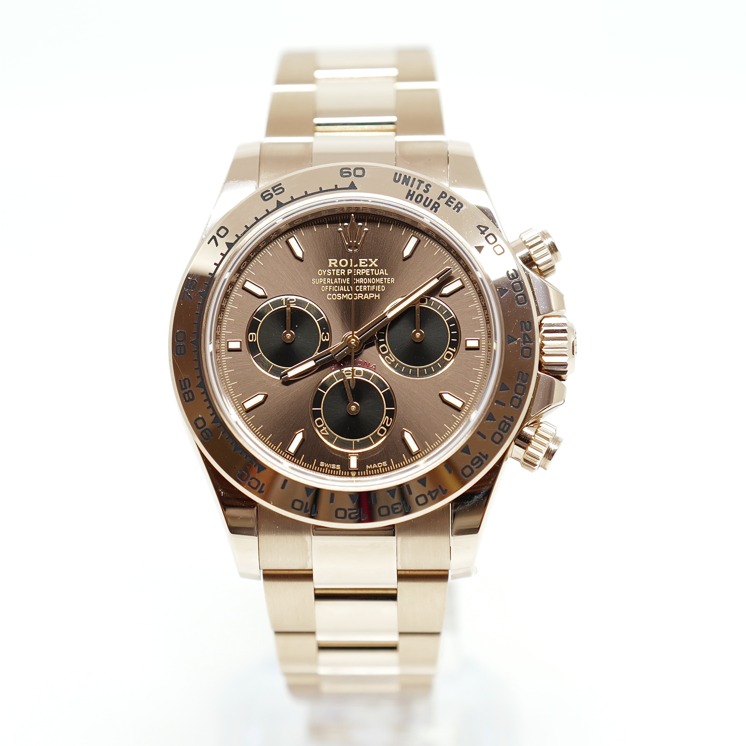 This Rolex Daytona 126505 has a chocolate baton dial and a bracelet strap. This Rolex has undergone a thorough inspection of water resistance, accuracy, functionality and condition to determine the level of reconditioning required to meet our strict standards. It has also been referenced against technical documents and manufacturer records where available to ensure authenticity and a clean history. Our watches have a 24-month warranty for your peace of mind, in conjunction with any remaining manufacturer’s warranty from new or from service. To maintain the manufacturer’s warranty on this watch, it has not been polished in our service centre.