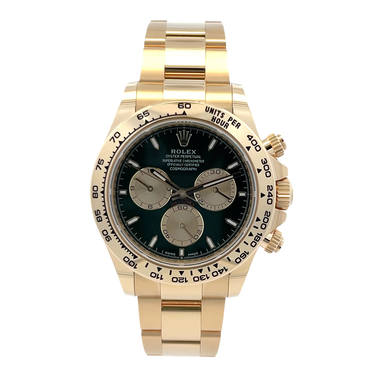 This Rolex Daytona 126508 has a green baton dial and a bracelet strap. This Rolex has undergone a thorough inspection of water resistance, accuracy, functionality and condition to determine the level of reconditioning required to meet our strict standards. It has also been referenced against technical documents and manufacturer records where available to ensure authenticity and a clean history. Our watches have a 24-month warranty for your peace of mind, in conjunction with any remaining manufacturer’s warranty from new or from service. To maintain the manufacturer’s warranty on this watch, it has not been polished in our service centre.