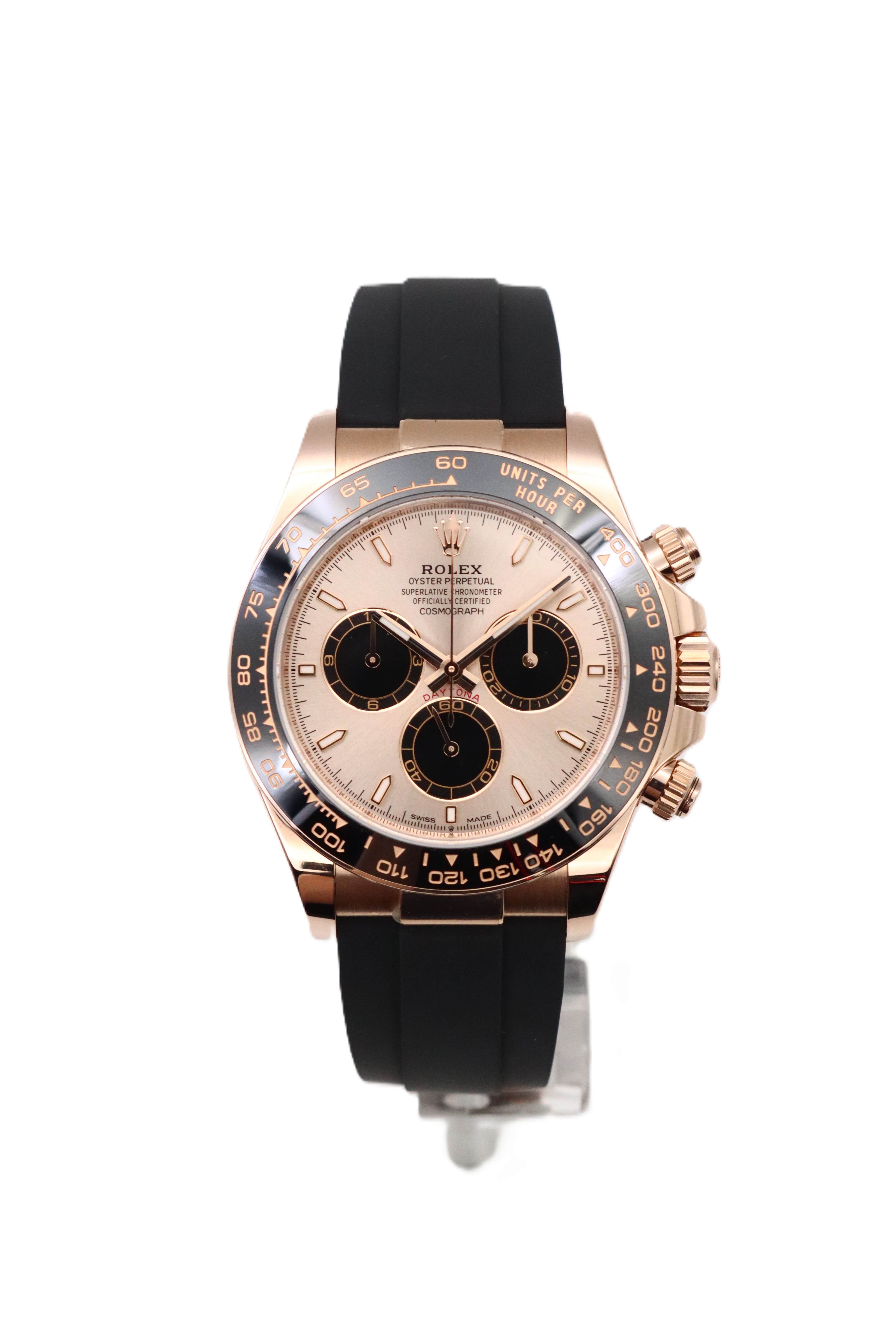 This Rolex Daytona 126515 LN has a sundust dial and a rubber strap. This Rolex has undergone a thorough inspection of water resistance, accuracy, functionality and condition to determine the level of reconditioning required to meet our strict standards. It has also been referenced against technical documents and manufacturer records where available to ensure authenticity and a clean history. Our watches have a 24-month warranty for your peace of mind, in conjunction with any remaining manufacturer’s warranty from new or from service. To maintain the manufacturer’s warranty on this watch, it has not been polished in our service centre.