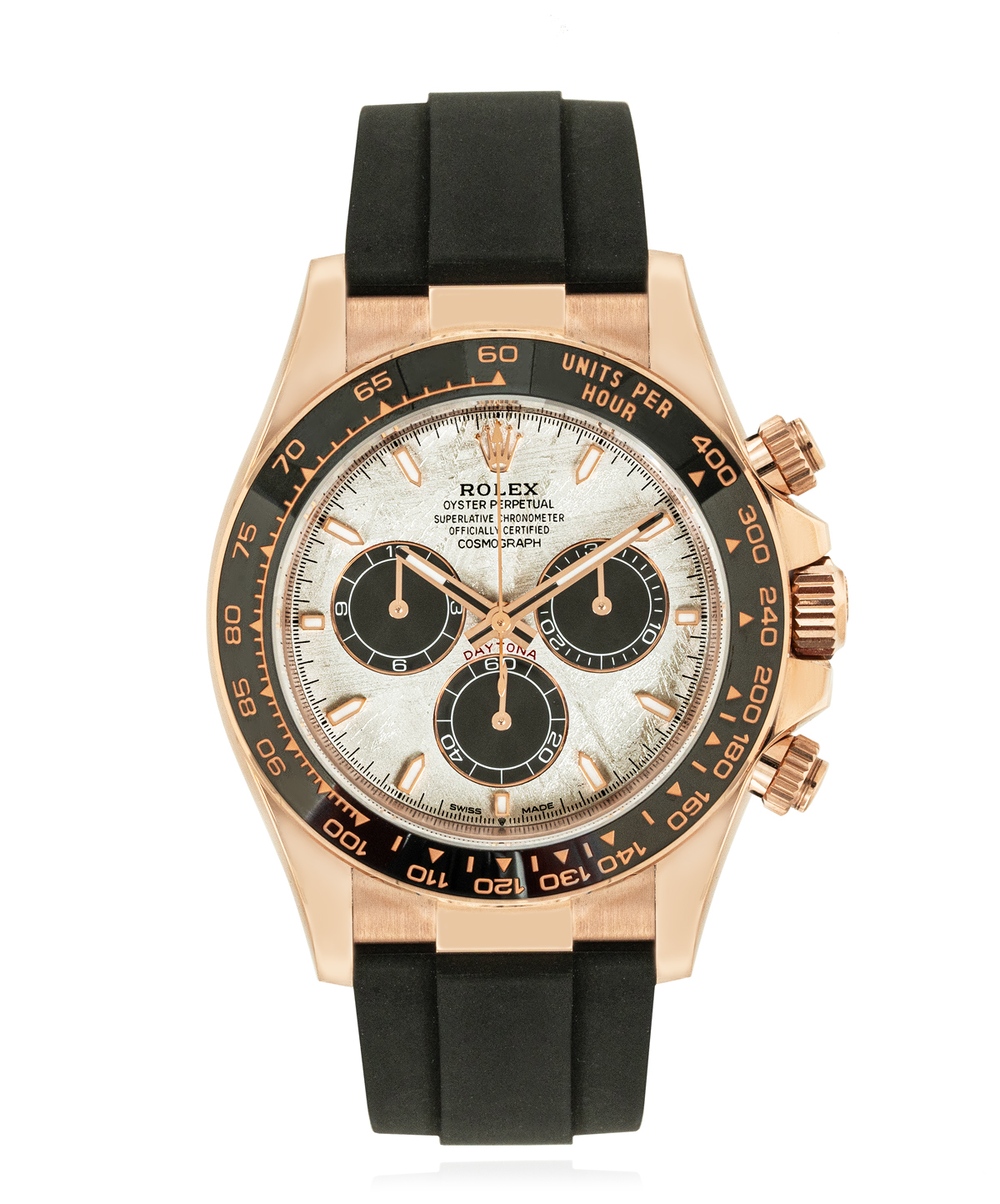 This Rolex Daytona 126515 LN has a meteorite dial and a rubber strap. This Rolex has undergone a thorough inspection of water resistance, accuracy, functionality and condition to determine the level of reconditioning required to meet our strict standards. It has also been referenced against technical documents and manufacturer records where available to ensure authenticity and a clean history. Our watches have a 24-month warranty for your peace of mind, in conjunction with any remaining manufacturer’s warranty from new or from service. To maintain the manufacturer’s warranty on this watch, it has not been polished in our service centre.