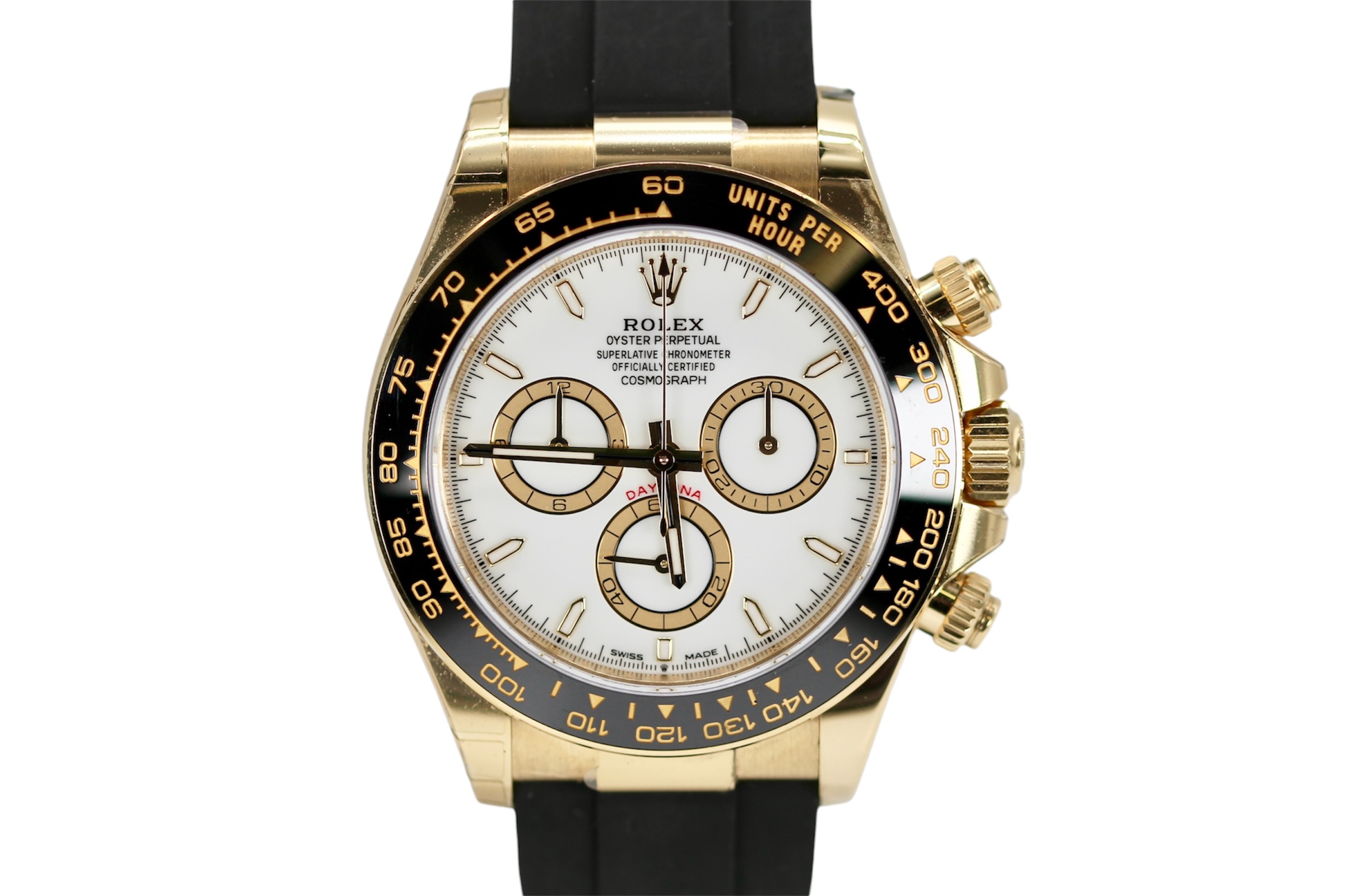 This Rolex Daytona 126518 LN has a white dial and a rubber strap. This Rolex has undergone a thorough inspection of water resistance, accuracy, functionality and condition to determine the level of reconditioning required to meet our strict standards. It has also been referenced against technical documents and manufacturer records where available to ensure authenticity and a clean history. Our watches have a 24-month warranty for your peace of mind, in conjunction with any remaining manufacturer’s warranty from new or from service. To maintain the manufacturer’s warranty on this watch, it has not been polished in our service centre.