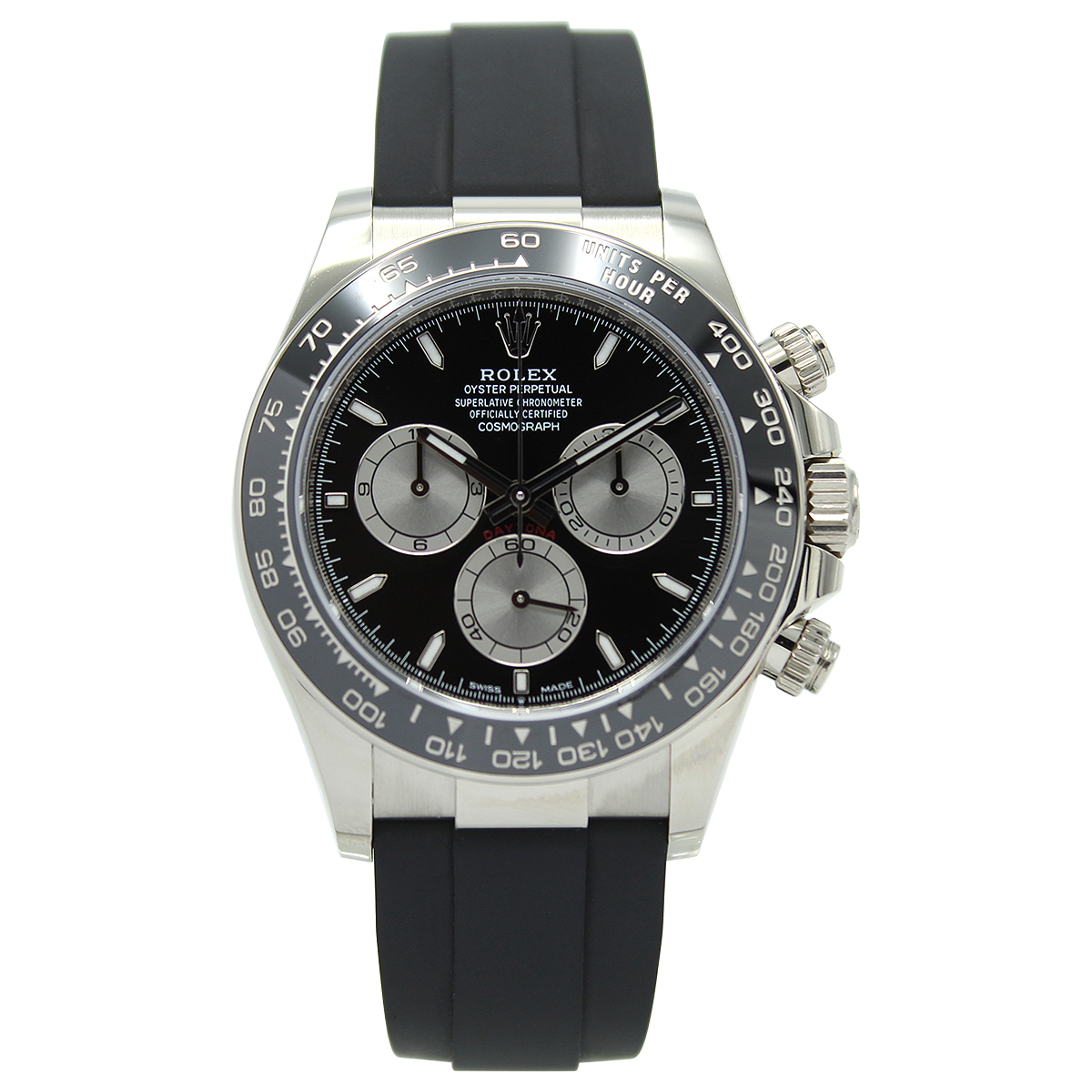 This Rolex Daytona 126519 LN has a black & steel dial and a rubber strap. This Rolex has undergone a thorough inspection of water resistance, accuracy, functionality and condition to determine the level of reconditioning required to meet our strict standards. It has also been referenced against technical documents and manufacturer records where available to ensure authenticity and a clean history. Our watches have a 24-month warranty for your peace of mind, in conjunction with any remaining manufacturer’s warranty from new or from service. To maintain the manufacturer’s warranty on this watch, it has not been polished in our service centre.