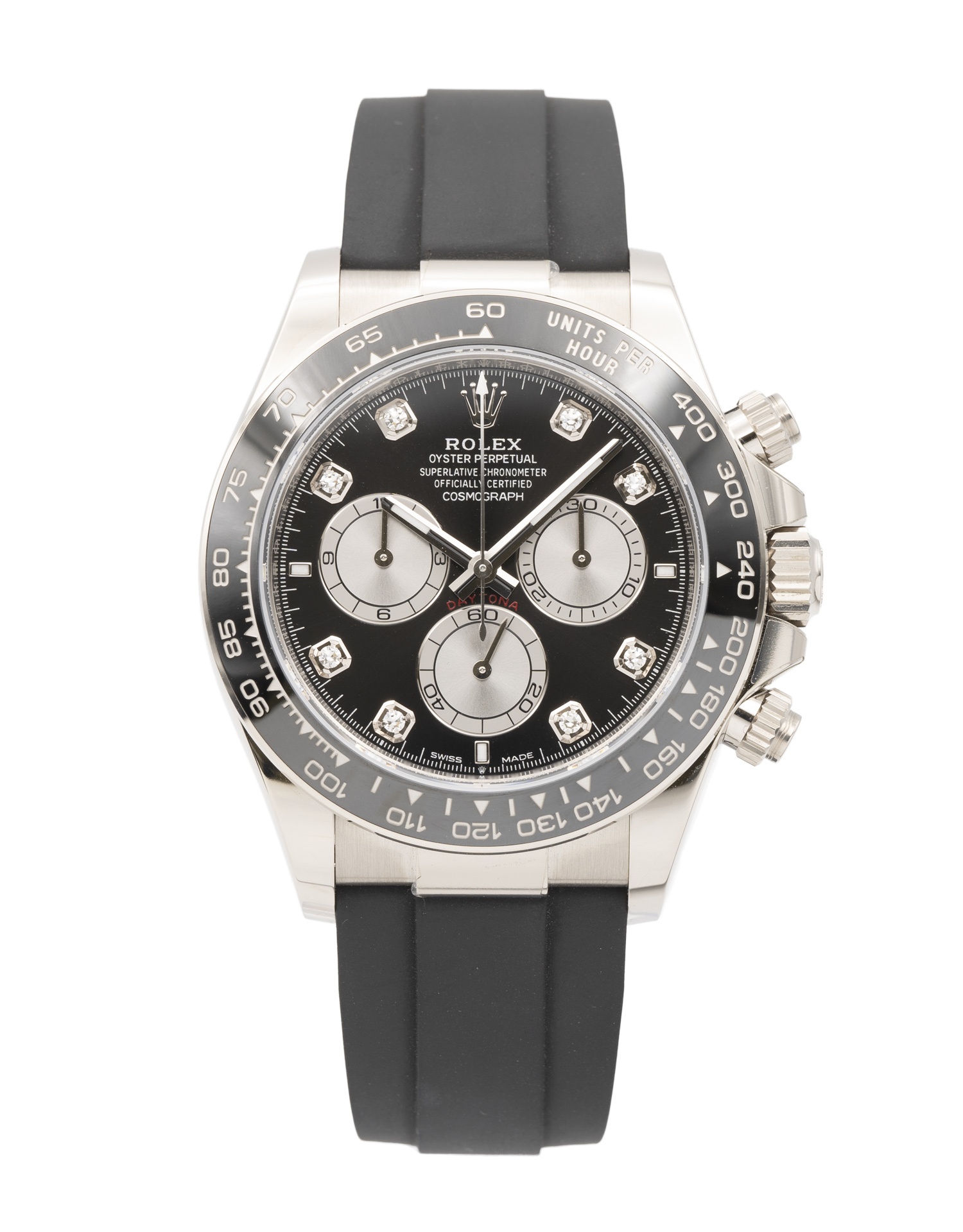 This Rolex Daytona 126519 LN has a black & steel diamond dial and a rubber strap. This Rolex has undergone a thorough inspection of water resistance, accuracy, functionality and condition to determine the level of reconditioning required to meet our strict standards. It has also been referenced against technical documents and manufacturer records where available to ensure authenticity and a clean history. All our watches have a 24-month warranty for your peace of mind. One of our skilled polishing technicians has removed marks on the case and bracelet of this watch, brought about by daily wear and tear, which is why this watch does not come with the remaining manufacturer’s warranty.