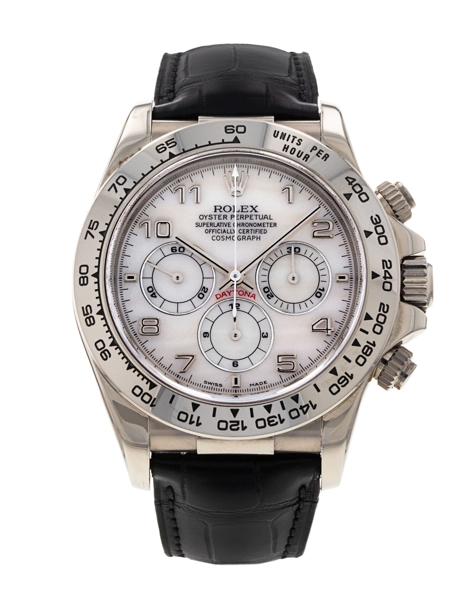 This Rolex Daytona 16519 has a mother of pearl white arabic dial and a leather strap. This Rolex has undergone a thorough inspection of water resistance, accuracy, functionality and condition to determine the level of reconditioning required to meet our strict standards. It has also been referenced against technical documents and manufacturer records where available to ensure authenticity and a clean history. All our watches have a 24-month warranty for your peace of mind. One of our skilled polishing technicians has removed marks on the case and bracelet of this watch, brought about by daily wear and tear, which is why this watch does not come with the remaining manufacturer’s warranty.