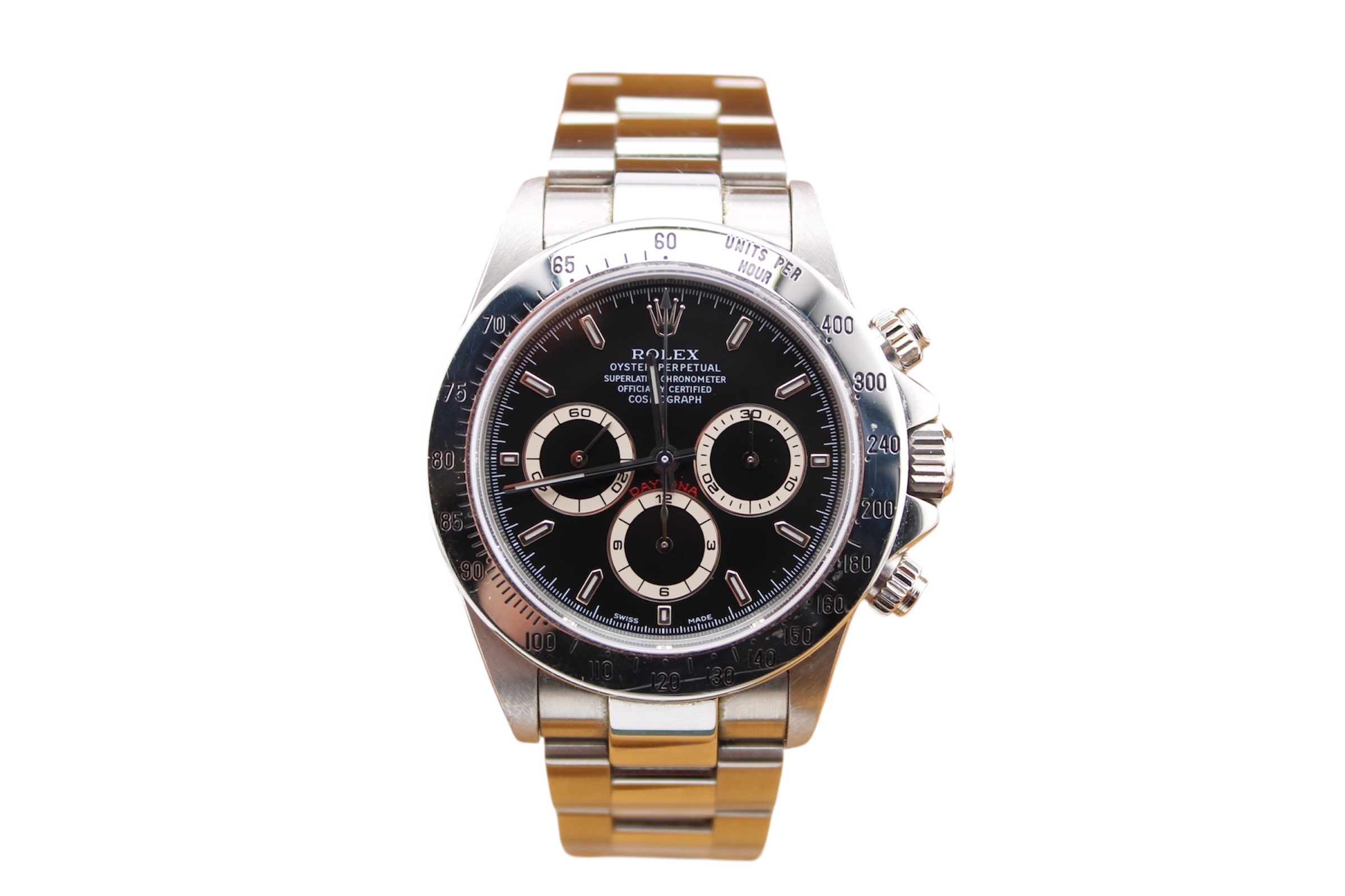 This Rolex Daytona 16520 has a black baton dial and a bracelet strap. This Rolex has undergone a thorough inspection of water resistance, accuracy, functionality and condition to determine the level of reconditioning required to meet our strict standards. It has also been referenced against technical documents and manufacturer records where available to ensure authenticity and a clean history. All our watches have a 24-month warranty for your peace of mind. One of our skilled polishing technicians has removed marks on the case and bracelet of this watch, brought about by daily wear and tear, which is why this watch does not come with the remaining manufacturer’s warranty.
