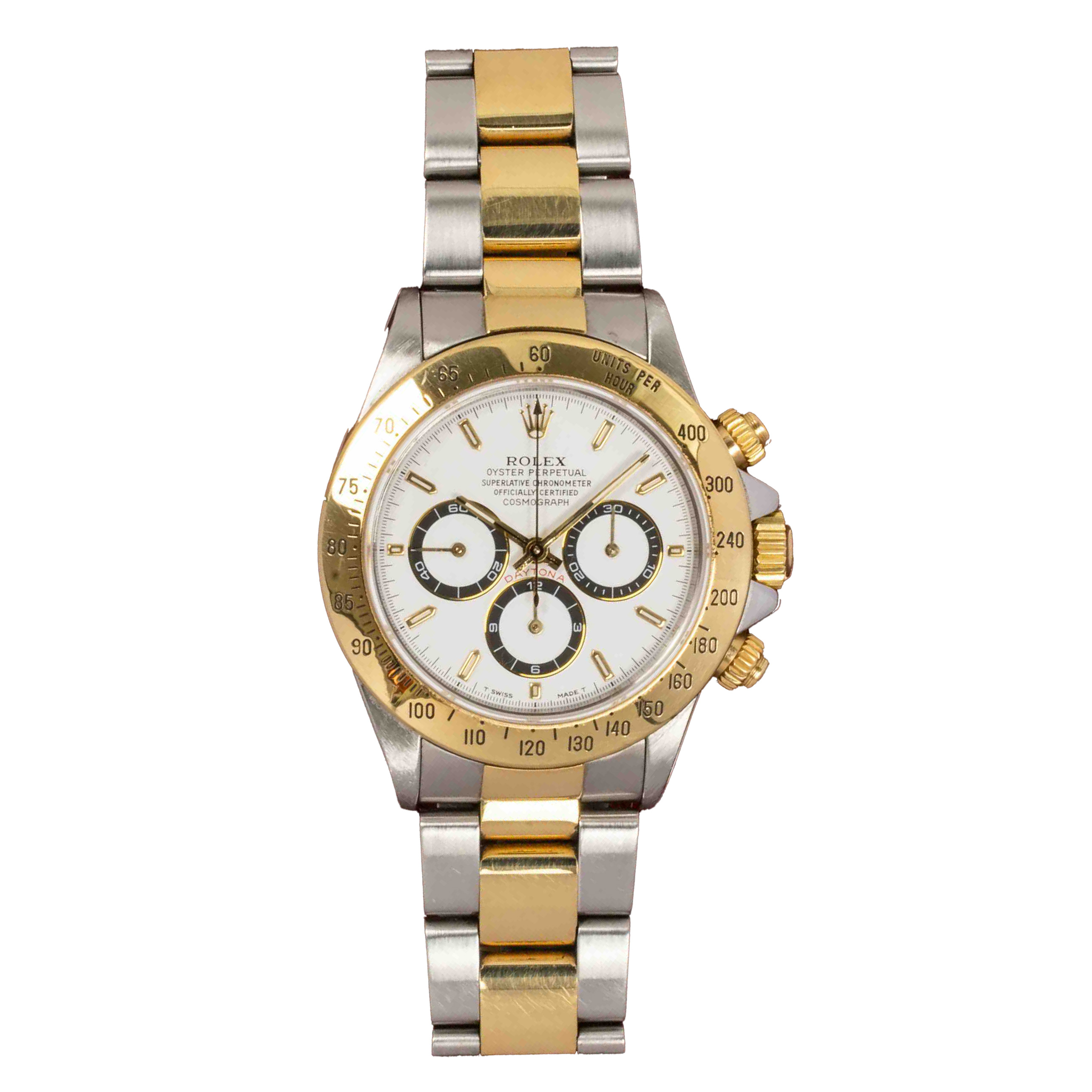 This Rolex Daytona 16523 has a white baton dial and a bracelet strap. This Rolex has undergone a thorough inspection of water resistance, accuracy, functionality and condition to determine the level of reconditioning required to meet our strict standards. It has also been referenced against technical documents and manufacturer records where available to ensure authenticity and a clean history. All our watches have a 24-month warranty for your peace of mind. One of our skilled polishing technicians has removed marks on the case and bracelet of this watch, brought about by daily wear and tear, which is why this watch does not come with the remaining manufacturer’s warranty.