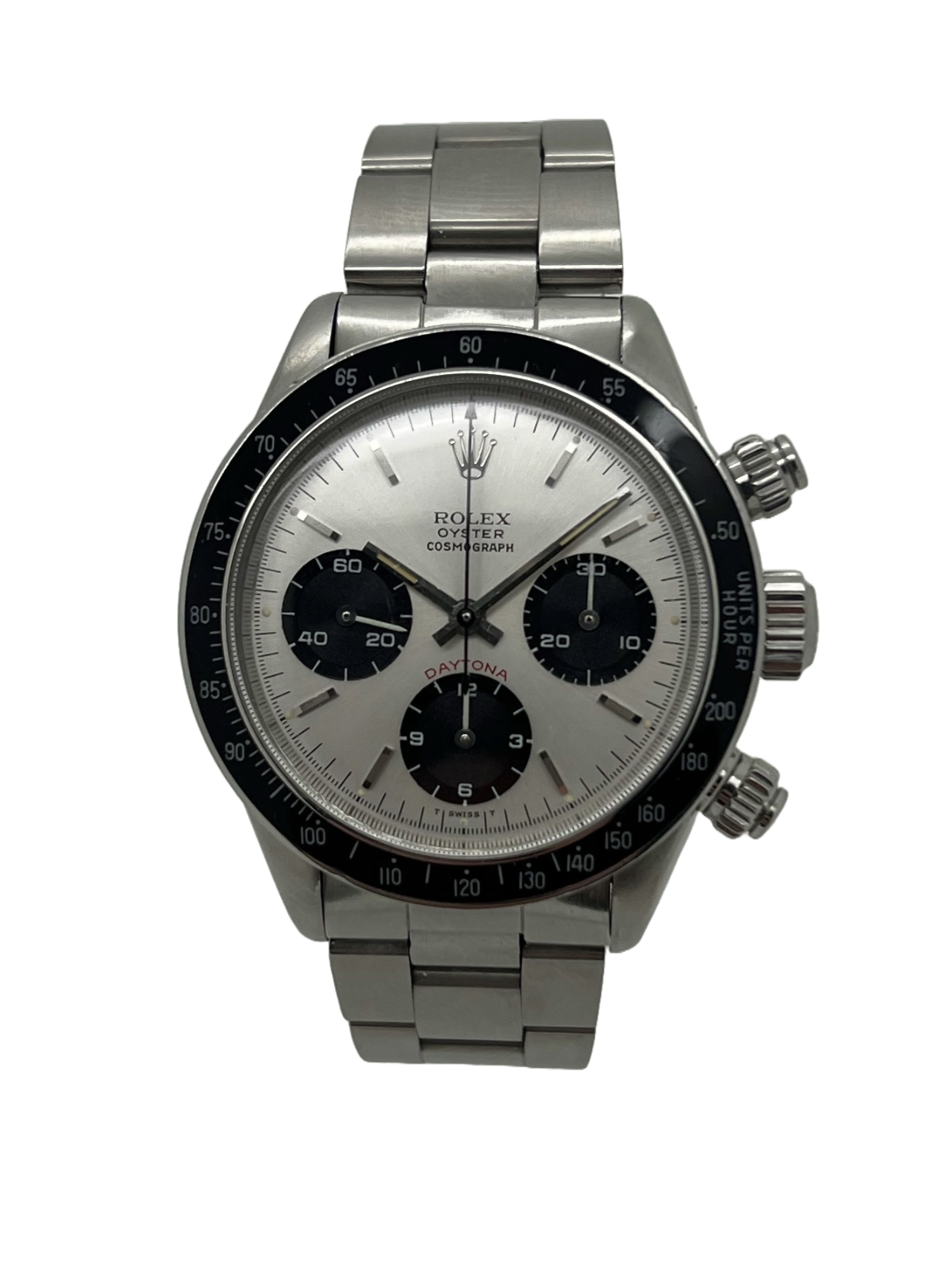 This Rolex Daytona 6263 has a silver baton dial and a bracelet strap. This Rolex has undergone a thorough inspection of water resistance, accuracy, functionality and condition to determine the level of reconditioning required to meet our strict standards. It has also been referenced against technical documents and manufacturer records where available to ensure authenticity and a clean history. All our watches have a 24-month warranty for your peace of mind. One of our skilled polishing technicians has removed marks on the case and bracelet of this watch, brought about by daily wear and tear, which is why this watch does not come with the remaining manufacturer’s warranty.