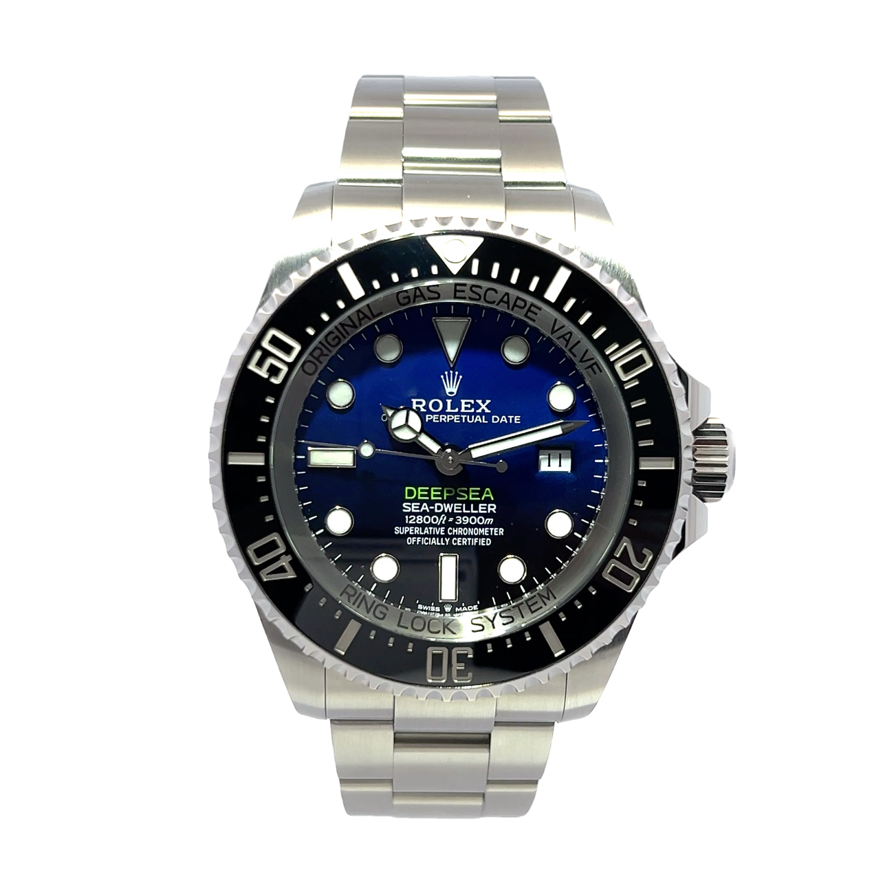 This Rolex Deepsea 116660 - D-Blue has a black & blue dial and a bracelet strap. This Rolex has undergone a thorough inspection of water resistance, accuracy, functionality and condition to determine the level of reconditioning required to meet our strict standards. It has also been referenced against technical documents and manufacturer records where available to ensure authenticity and a clean history. All our watches have a 24-month warranty for your peace of mind. One of our skilled polishing technicians has removed marks on the case and bracelet of this watch, brought about by daily wear and tear, which is why this watch does not come with the remaining manufacturer’s warranty.