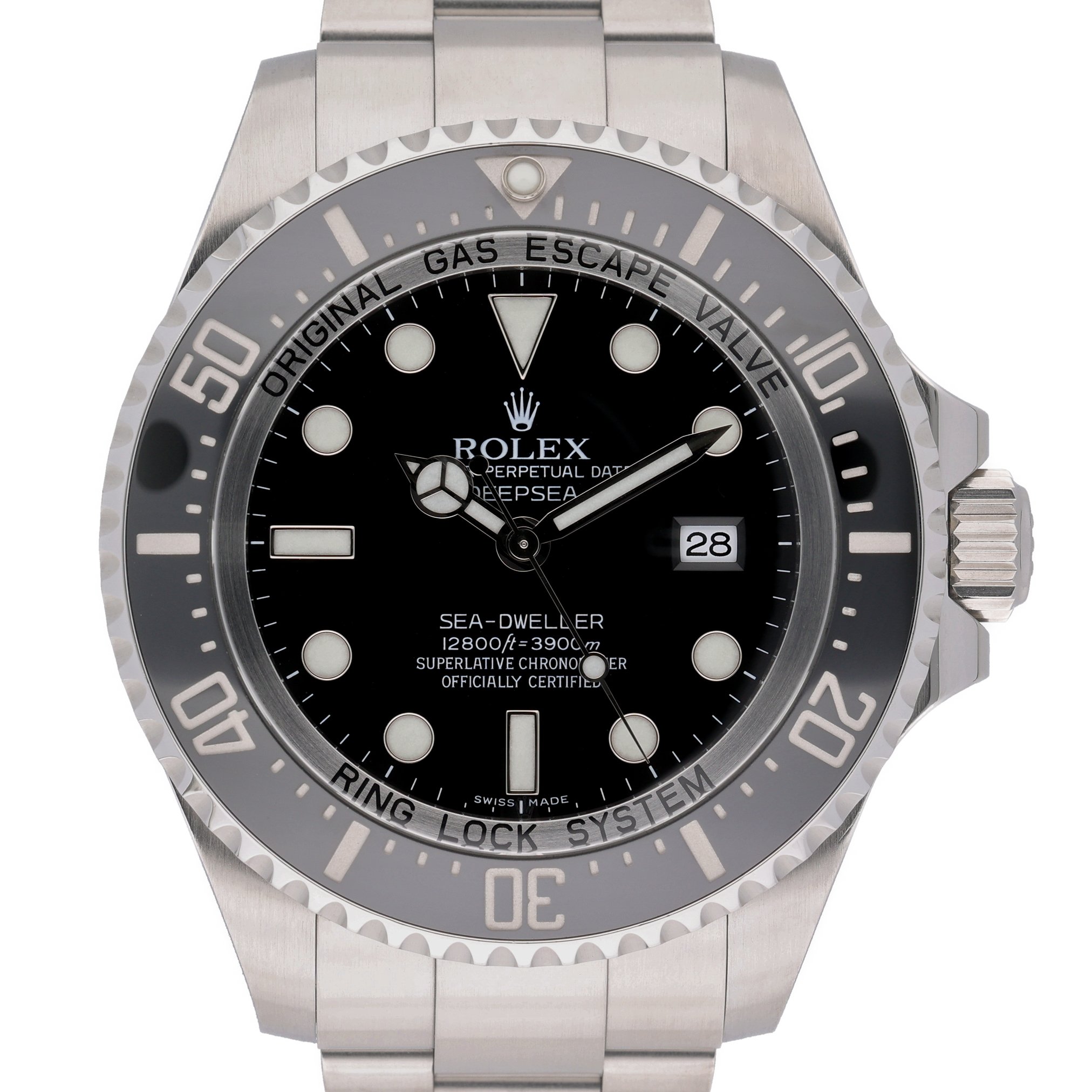 This Rolex Deepsea 116660 has a black dial and a bracelet strap. This Rolex has undergone a thorough inspection of water resistance, accuracy, functionality and condition to determine the level of reconditioning required to meet our strict standards. It has also been referenced against technical documents and manufacturer records where available to ensure authenticity and a clean history. All our watches have a 24-month warranty for your peace of mind. One of our skilled polishing technicians has removed marks on the case and bracelet of this watch, brought about by daily wear and tear, which is why this watch does not come with the remaining manufacturer’s warranty.