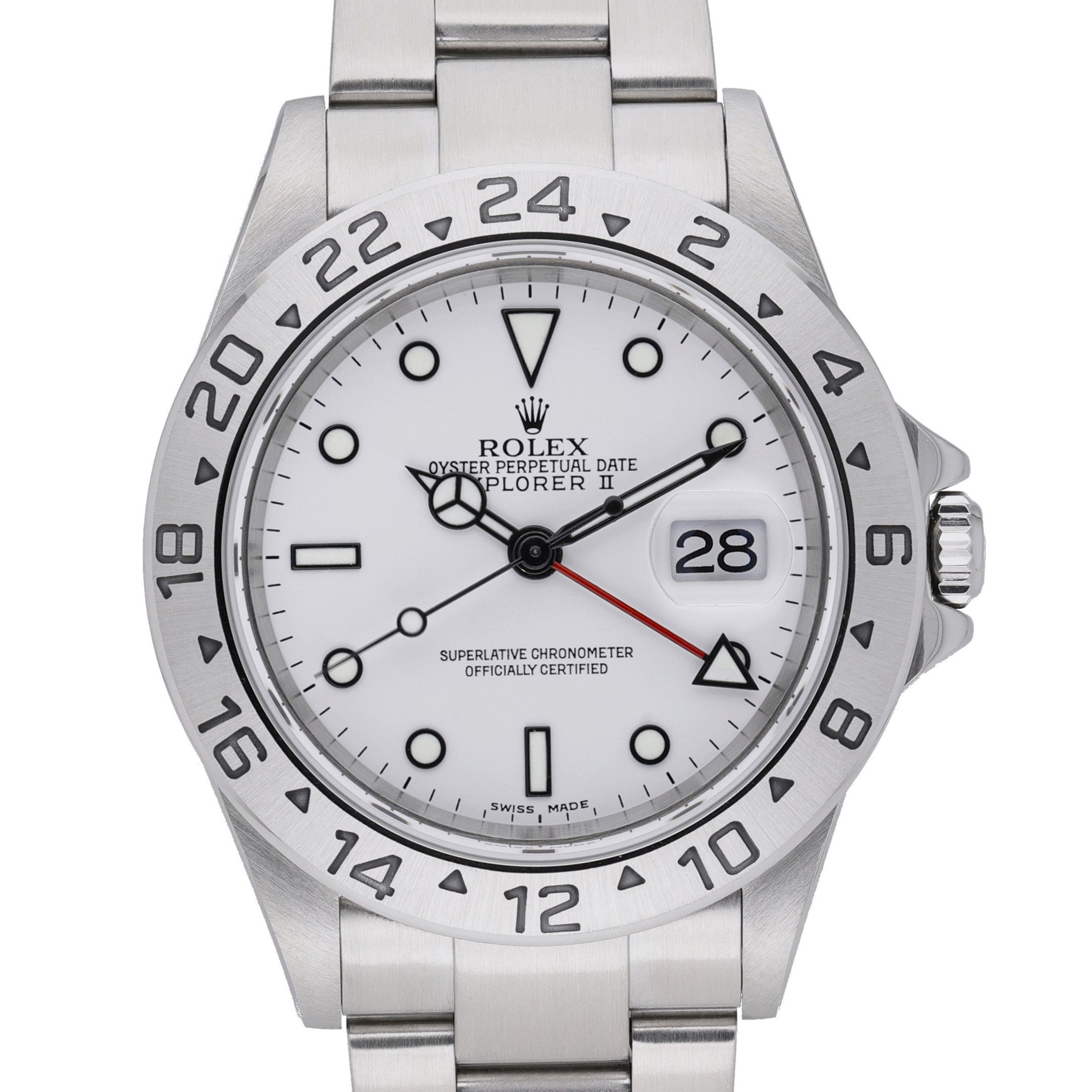This Rolex Explorer II 16570 has a white dial and a bracelet strap. This Rolex has undergone a thorough inspection of water resistance, accuracy, functionality and condition to determine the level of reconditioning required to meet our strict standards. It has also been referenced against technical documents and manufacturer records where available to ensure authenticity and a clean history. All our watches have a 24-month warranty for your peace of mind. One of our skilled polishing technicians has removed marks on the case and bracelet of this watch, brought about by daily wear and tear, which is why this watch does not come with the remaining manufacturer’s warranty.