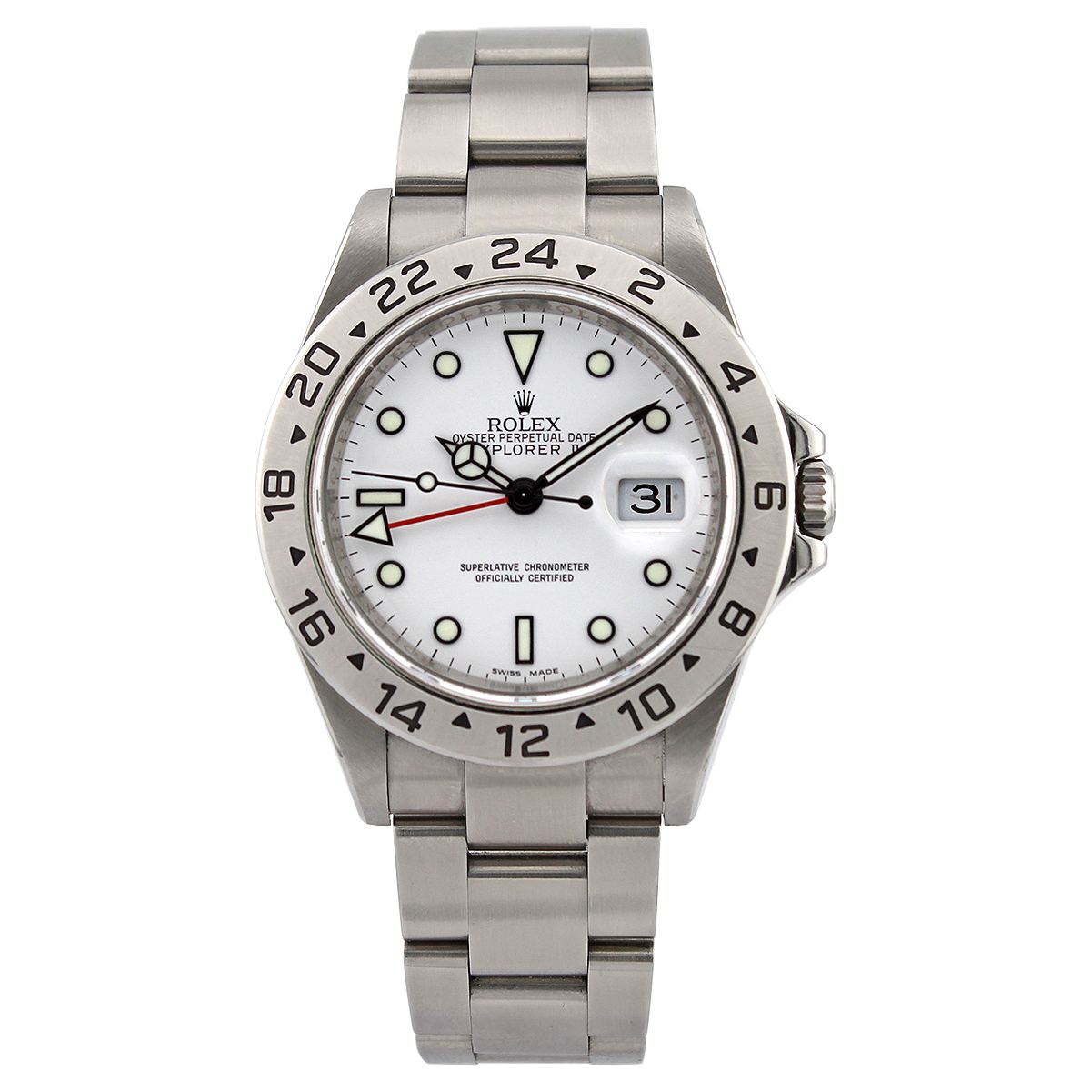 This Rolex Explorer II 16570 has a white dial and a bracelet strap. This Rolex has undergone a thorough inspection of water resistance, accuracy, functionality and condition to determine the level of reconditioning required to meet our strict standards. It has also been referenced against technical documents and manufacturer records where available to ensure authenticity and a clean history. All our watches have a 24-month warranty for your peace of mind. One of our skilled polishing technicians has removed marks on the case and bracelet of this watch, brought about by daily wear and tear, which is why this watch does not come with the remaining manufacturer’s warranty.