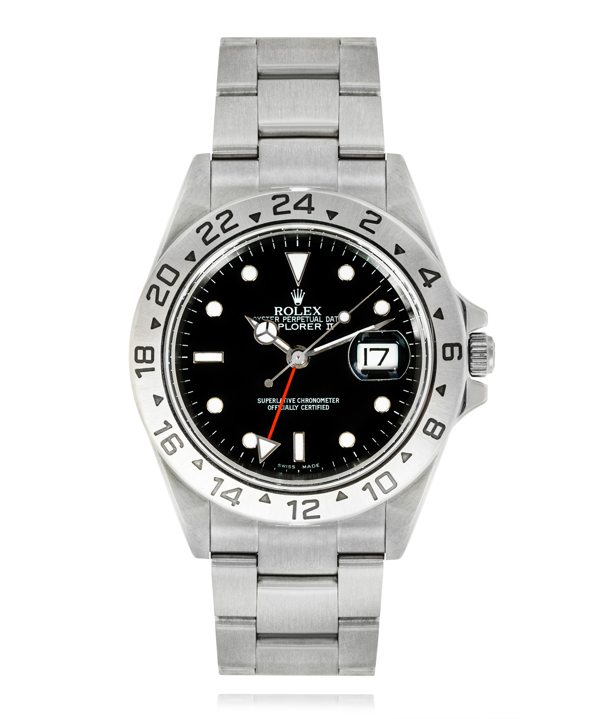 This Rolex Explorer II 16570 has a black dial and a bracelet strap. This Rolex has undergone a thorough inspection of water resistance, accuracy, functionality and condition to determine the level of reconditioning required to meet our strict standards. It has also been referenced against technical documents and manufacturer records where available to ensure authenticity and a clean history. All our watches have a 24-month warranty for your peace of mind. One of our skilled polishing technicians has removed marks on the case and bracelet of this watch, brought about by daily wear and tear, which is why this watch does not come with the remaining manufacturer’s warranty.