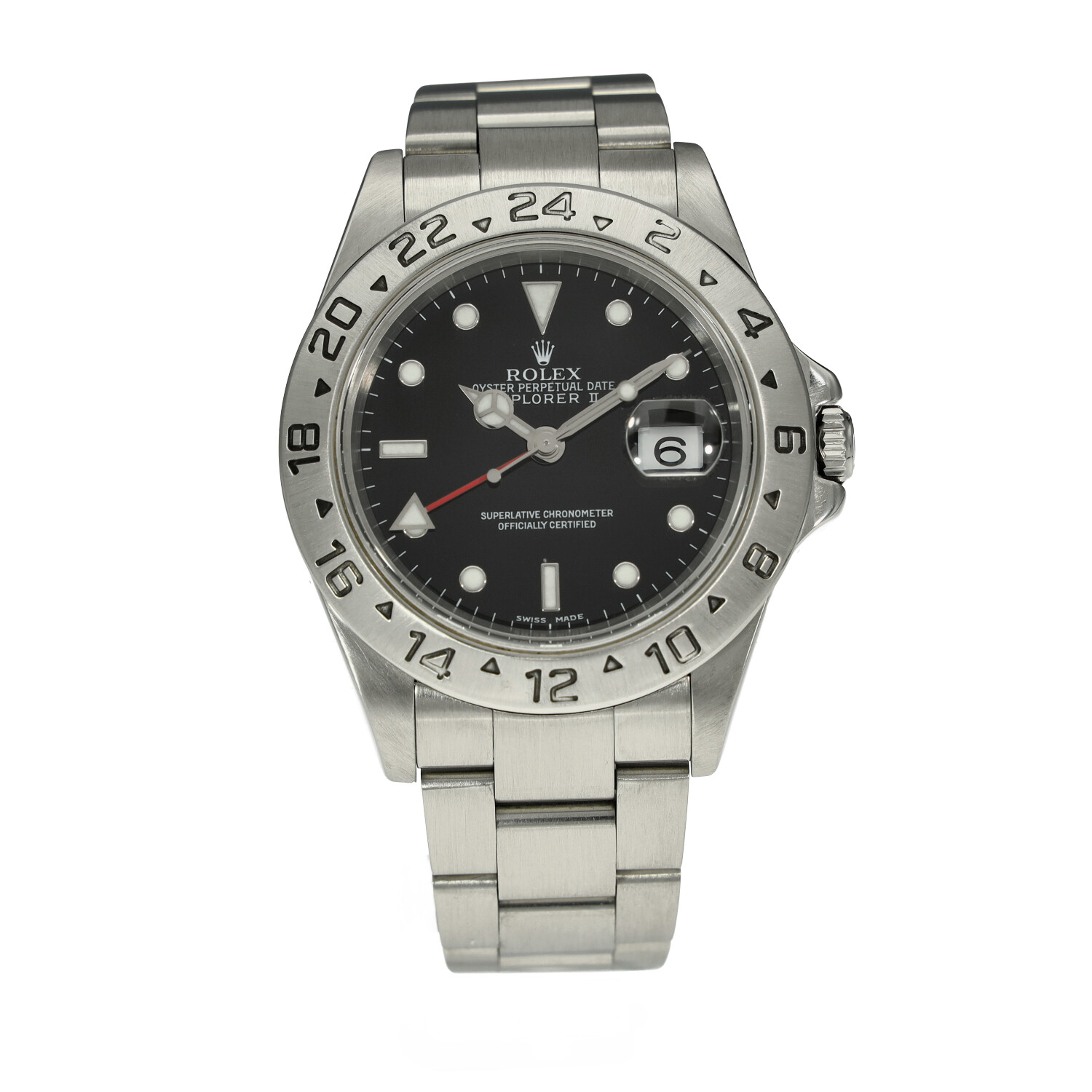 This Rolex Explorer II 16570 has a black dial and a bracelet strap. This Rolex has undergone a thorough inspection of water resistance, accuracy, functionality and condition to determine the level of reconditioning required to meet our strict standards. It has also been referenced against technical documents and manufacturer records where available to ensure authenticity and a clean history. All our watches have a 24-month warranty for your peace of mind. One of our skilled polishing technicians has removed marks on the case and bracelet of this watch, brought about by daily wear and tear, which is why this watch does not come with the remaining manufacturer’s warranty.