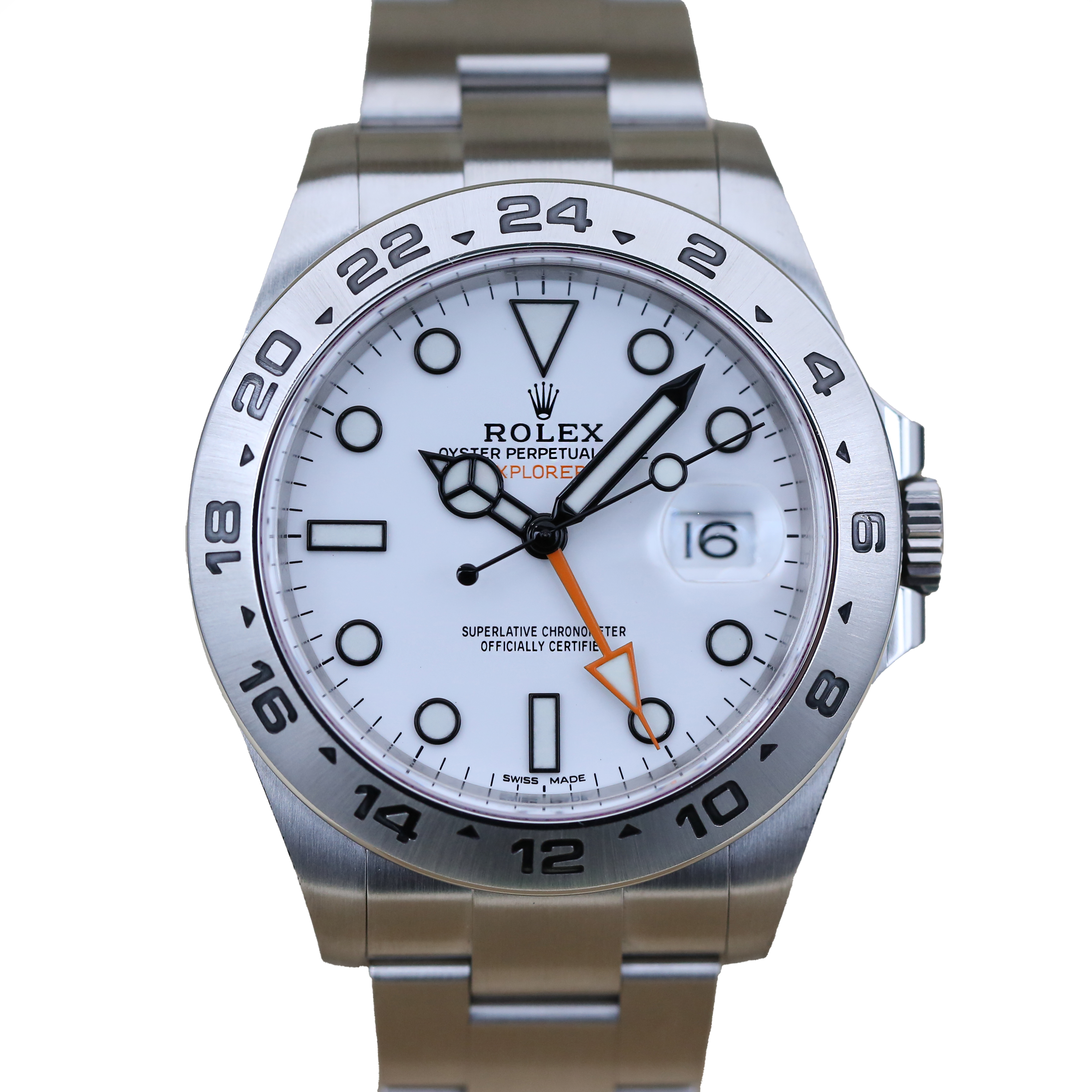 This Rolex Explorer II 216570 has a white dial and a bracelet strap. This Rolex has undergone a thorough inspection of water resistance, accuracy, functionality and condition to determine the level of reconditioning required to meet our strict standards. It has also been referenced against technical documents and manufacturer records where available to ensure authenticity and a clean history. All our watches have a 24-month warranty for your peace of mind. One of our skilled polishing technicians has removed marks on the case and bracelet of this watch, brought about by daily wear and tear, which is why this watch does not come with the remaining manufacturer’s warranty.