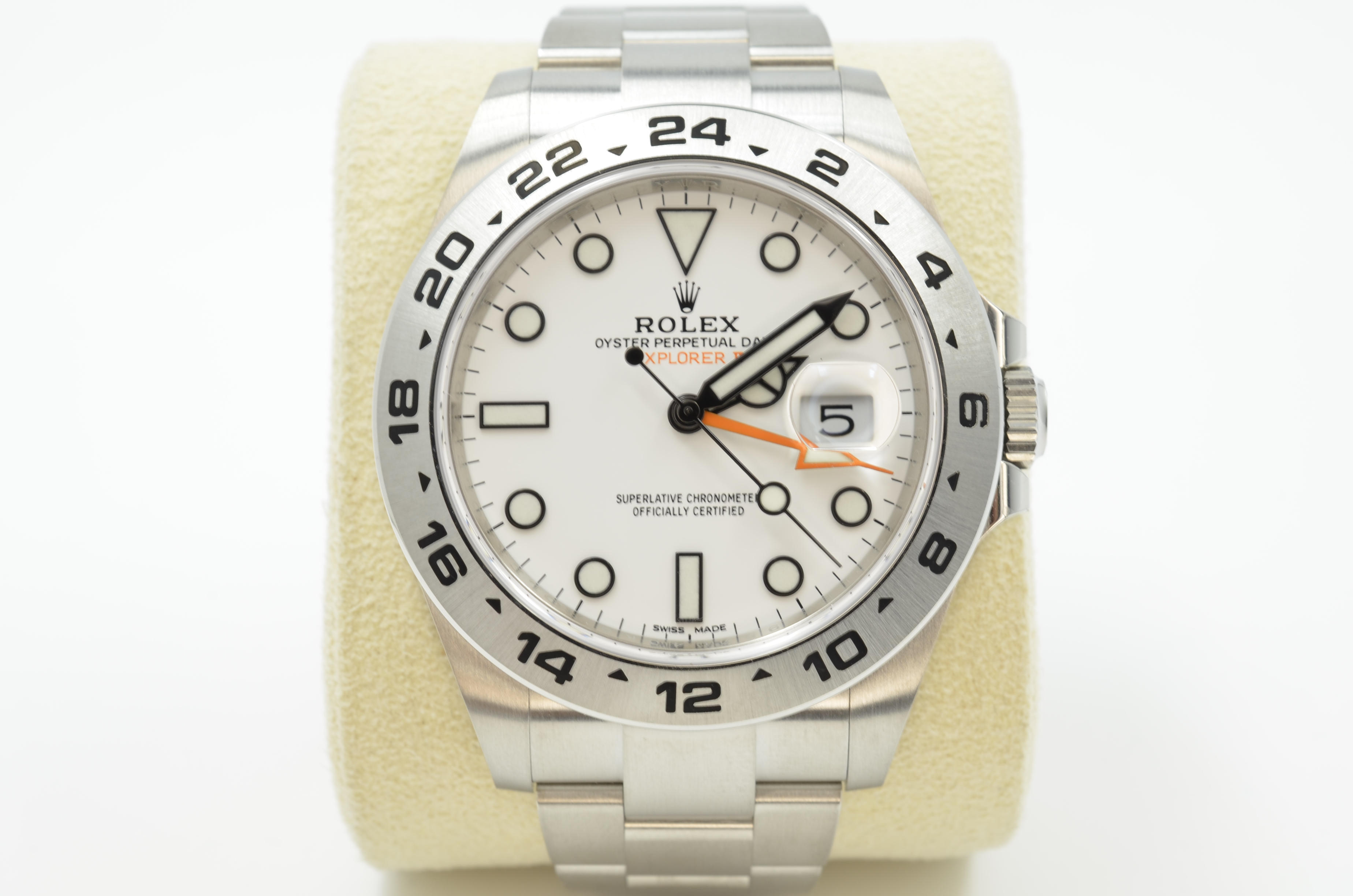 This Rolex Explorer II 216570 has a white dial and a bracelet strap. This Rolex has undergone a thorough inspection of water resistance, accuracy, functionality and condition to determine the level of reconditioning required to meet our strict standards. It has also been referenced against technical documents and manufacturer records where available to ensure authenticity and a clean history. All our watches have a 24-month warranty for your peace of mind. One of our skilled polishing technicians has removed marks on the case and bracelet of this watch, brought about by daily wear and tear, which is why this watch does not come with the remaining manufacturer’s warranty.