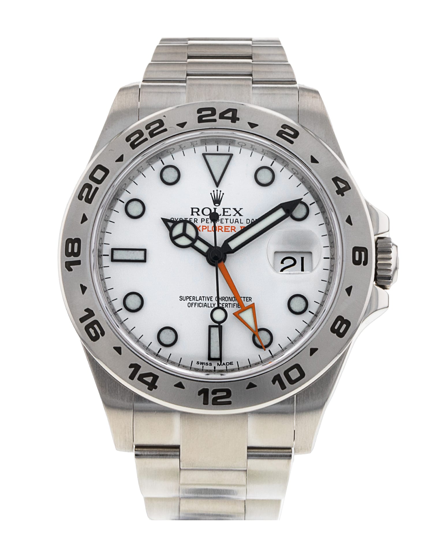 This Rolex Explorer II 216570 has a white dial and a bracelet strap. This Rolex has undergone a thorough inspection of water resistance, accuracy, functionality and condition to determine the level of reconditioning required to meet our strict standards. It has also been referenced against technical documents and manufacturer records where available to ensure authenticity and a clean history. All our watches have a 24-month warranty for your peace of mind. One of our skilled polishing technicians has removed marks on the case and bracelet of this watch, brought about by daily wear and tear, which is why this watch does not come with the remaining manufacturer’s warranty.