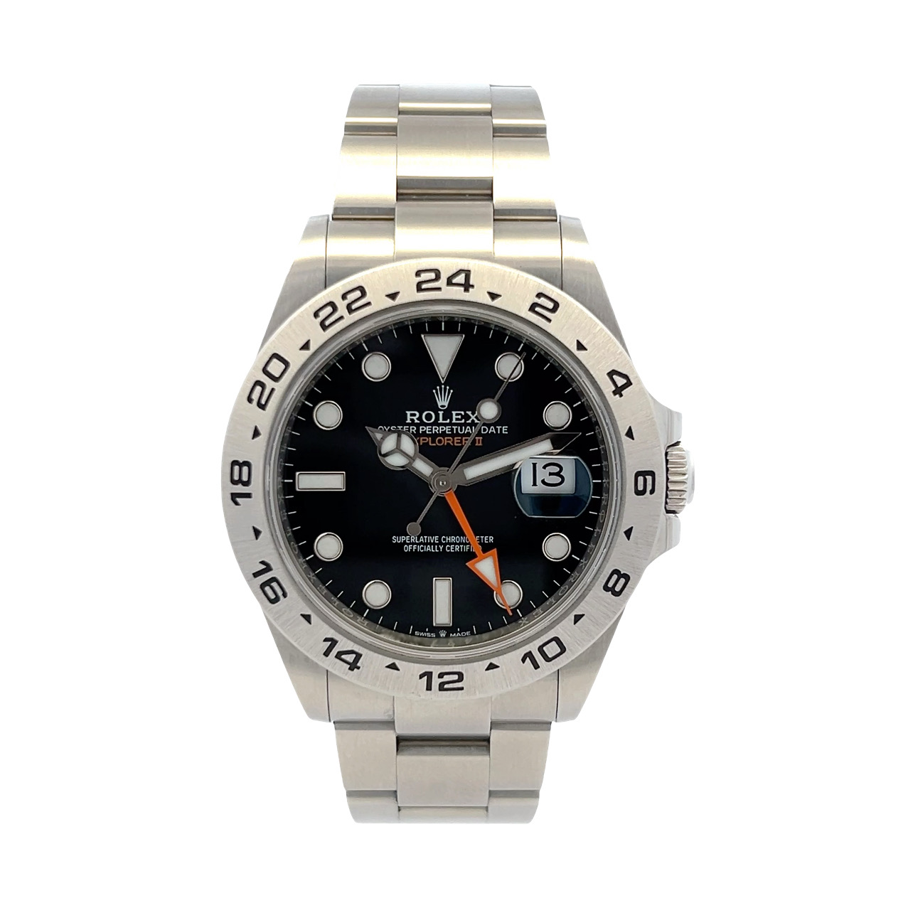 This Rolex Explorer II 226570 has a black dial and a bracelet strap. This Rolex has undergone a thorough inspection of water resistance, accuracy, functionality and condition to determine the level of reconditioning required to meet our strict standards. It has also been referenced against technical documents and manufacturer records where available to ensure authenticity and a clean history. Our watches have a 24-month warranty for your peace of mind, in conjunction with any remaining manufacturer’s warranty from new or from service. To maintain the manufacturer’s warranty on this watch, it has not been polished in our service centre.