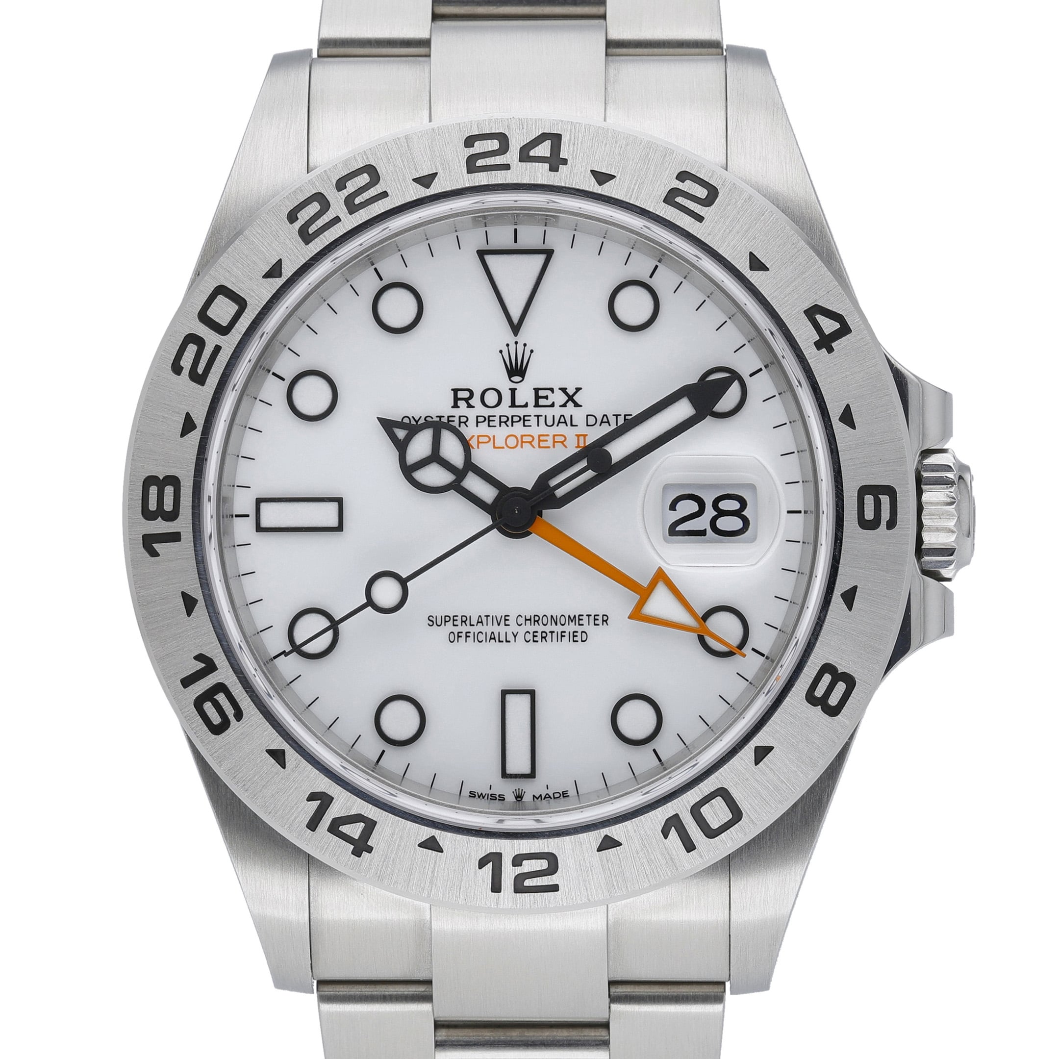 This Rolex Explorer II 226570 has a white dial and a bracelet strap. This Rolex has undergone a thorough inspection of water resistance, accuracy, functionality and condition to determine the level of reconditioning required to meet our strict standards. It has also been referenced against technical documents and manufacturer records where available to ensure authenticity and a clean history. Our watches have a 24-month warranty for your peace of mind, in conjunction with any remaining manufacturer’s warranty from new or from service. To maintain the manufacturer’s warranty on this watch, it has not been polished in our service centre.
