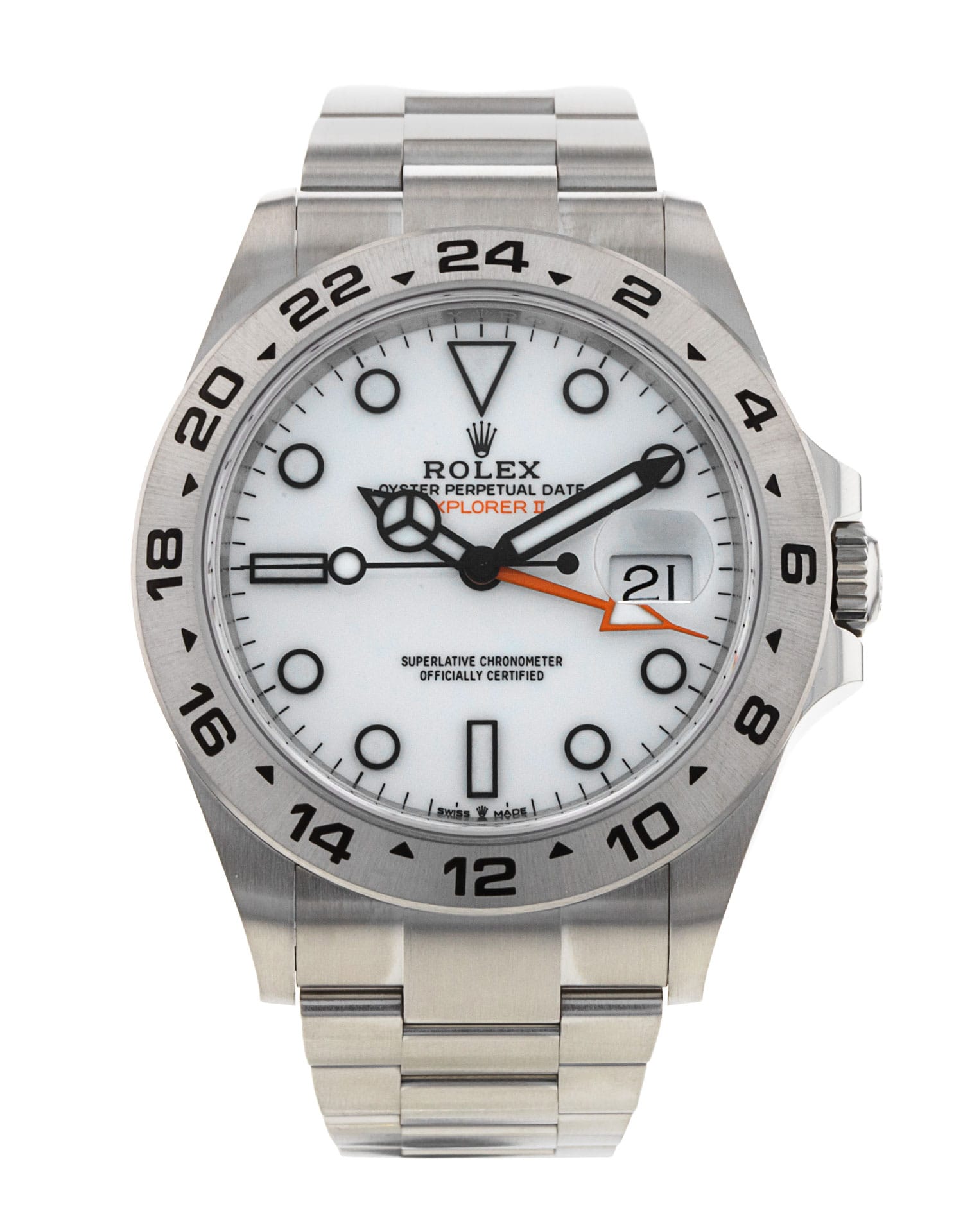 This Rolex Explorer II 226570 has a white dial and a bracelet strap. This Rolex has undergone a thorough inspection of water resistance, accuracy, functionality and condition to determine the level of reconditioning required to meet our strict standards. It has also been referenced against technical documents and manufacturer records where available to ensure authenticity and a clean history. Our watches have a 24-month warranty for your peace of mind, in conjunction with any remaining manufacturer’s warranty from new or from service. To maintain the manufacturer’s warranty on this watch, it has not been polished in our service centre.