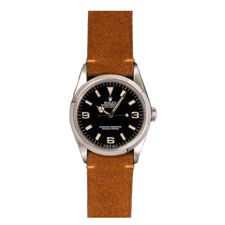 This Rolex Explorer 114270 has a black quarter arabic dial and a leather strap. This Rolex has undergone a thorough inspection of water resistance, accuracy, functionality and condition to determine the level of reconditioning required to meet our strict standards. It has also been referenced against technical documents and manufacturer records where available to ensure authenticity and a clean history. All our watches have a 24-month warranty for your peace of mind. One of our skilled polishing technicians has removed marks on the case and bracelet of this watch, brought about by daily wear and tear, which is why this watch does not come with the remaining manufacturer’s warranty.