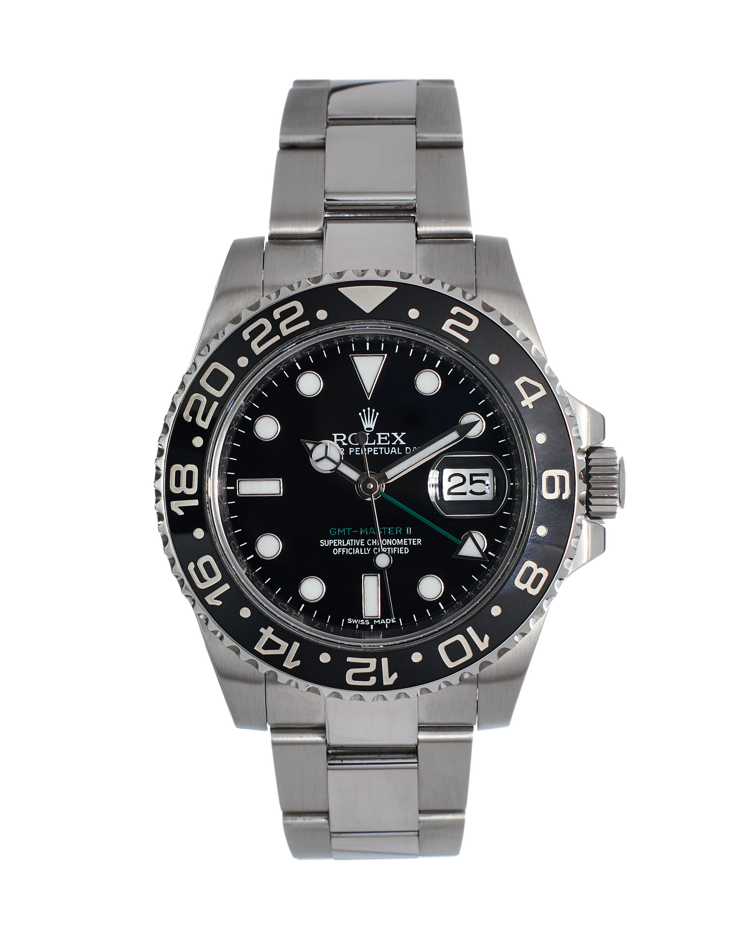 This Rolex GMT Master II 116710 LN has a black dial and a bracelet strap. This Rolex has undergone a thorough inspection of water resistance, accuracy, functionality and condition to determine the level of reconditioning required to meet our strict standards. It has also been referenced against technical documents and manufacturer records where available to ensure authenticity and a clean history. All our watches have a 24-month warranty for your peace of mind. One of our skilled polishing technicians has removed marks on the case and bracelet of this watch, brought about by daily wear and tear, which is why this watch does not come with the remaining manufacturer’s warranty.