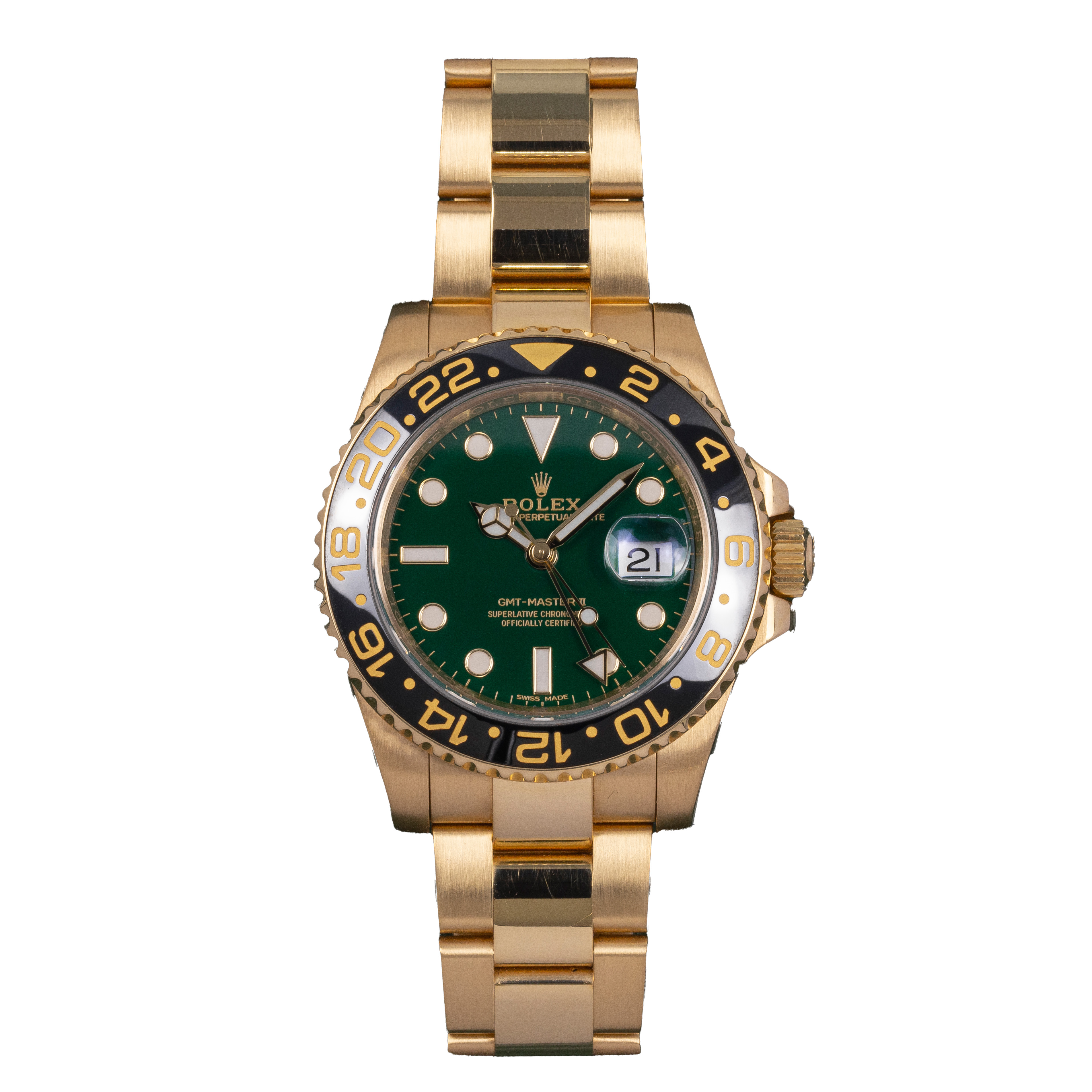This Rolex GMT Master II 116718 LN has a green dial and a bracelet strap. This Rolex has undergone a thorough inspection of water resistance, accuracy, functionality and condition to determine the level of reconditioning required to meet our strict standards. It has also been referenced against technical documents and manufacturer records where available to ensure authenticity and a clean history. All our watches have a 24-month warranty for your peace of mind. One of our skilled polishing technicians has removed marks on the case and bracelet of this watch, brought about by daily wear and tear, which is why this watch does not come with the remaining manufacturer’s warranty.