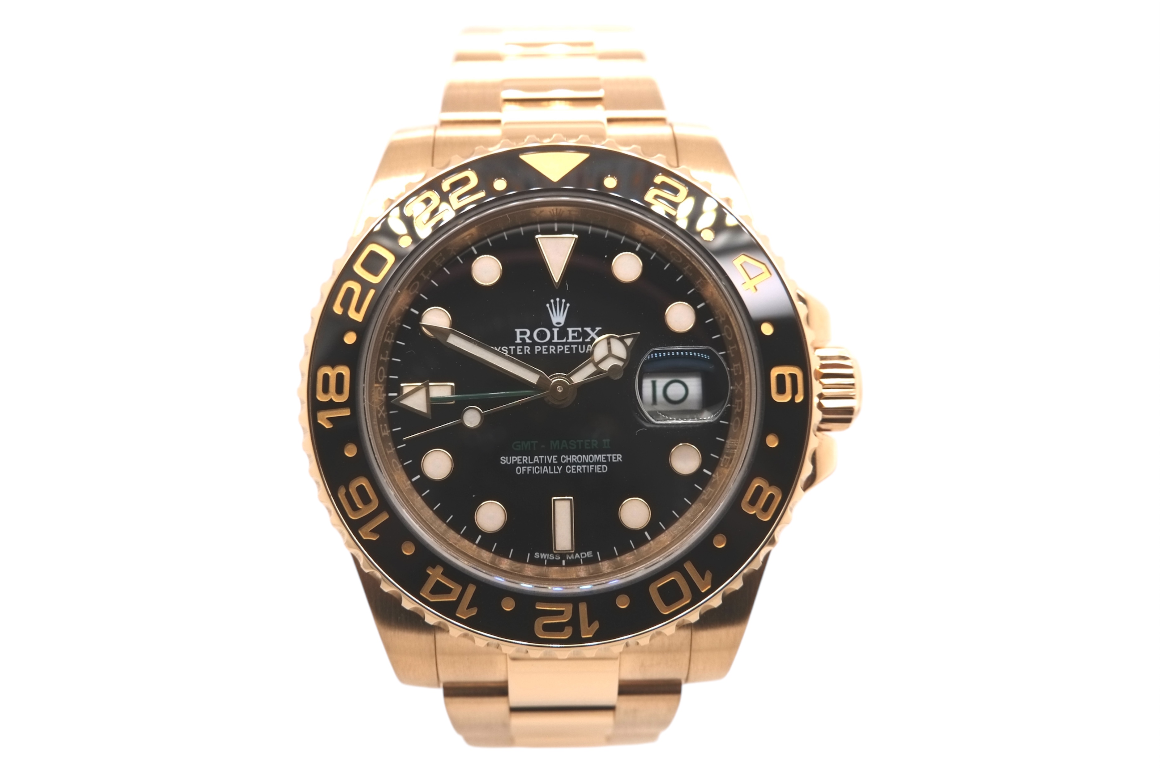 The GMT Master was first commissioned in the 1950s by pioneering airline Pan Am, and was designed for aviation. An increase in flight distances created demand for a watch that was able to tell the time in two different parts of the world simultaneously, so Rolex built it with an additional hand that could be set to a second time zone. By the 1980s, the watch had developed into the GMT Master II and was already a favourite among collectors. This recent model represents a significant upgrade for the watch, boasting a cutting-edge movement, a magnificent gold case and bracelet, and high-tech cerachrom inserts in the bezel. The LN moniker stands for Lunette Noir—signifying that it uses an all-black bezel.