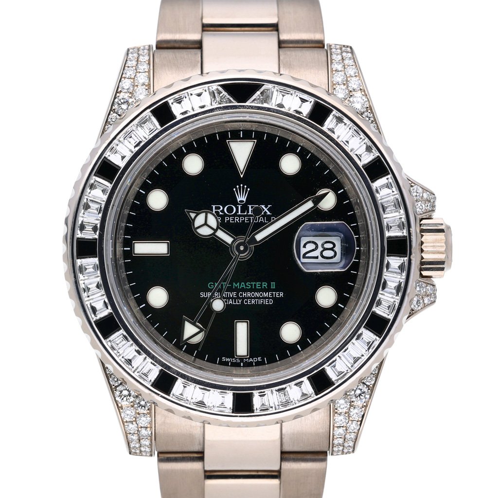 This Rolex GMT Master II 116759 SANR has a black baton dial and a bracelet strap. This Rolex has undergone a thorough inspection of water resistance, accuracy, functionality and condition to determine the level of reconditioning required to meet our strict standards. It has also been referenced against technical documents and manufacturer records where available to ensure authenticity and a clean history. All our watches have a 24-month warranty for your peace of mind. One of our skilled polishing technicians has removed marks on the case and bracelet of this watch, brought about by daily wear and tear, which is why this watch does not come with the remaining manufacturer’s warranty.