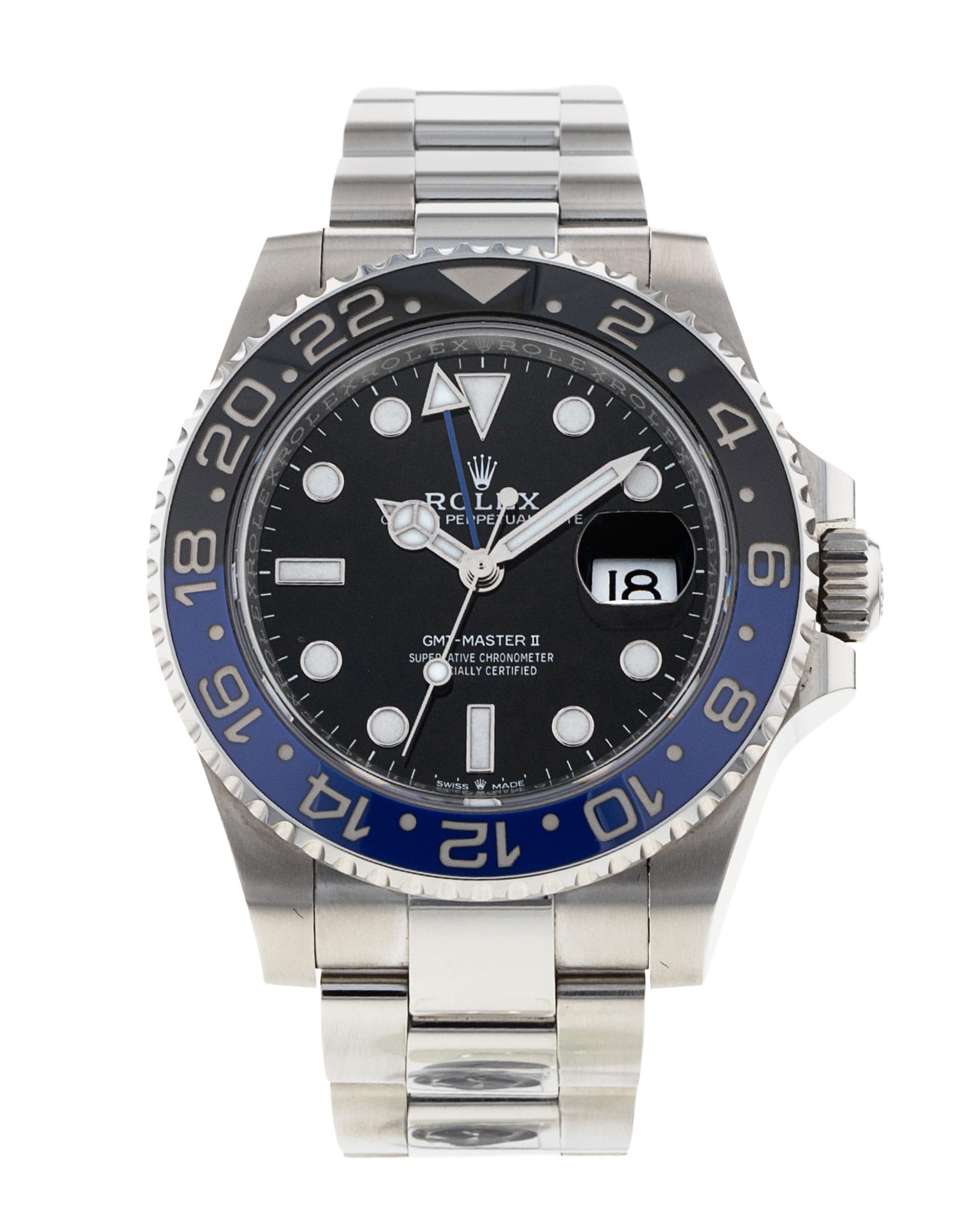 This Rolex GMT Master II 126710 BLNR has a black dial and a bracelet strap. This Rolex has undergone a thorough inspection of water resistance, accuracy, functionality and condition to determine the level of reconditioning required to meet our strict standards. It has also been referenced against technical documents and manufacturer records where available to ensure authenticity and a clean history. Our watches have a 24-month warranty for your peace of mind, in conjunction with any remaining manufacturer’s warranty from new or from service. To maintain the manufacturer’s warranty on this watch, it has not been polished in our service centre.