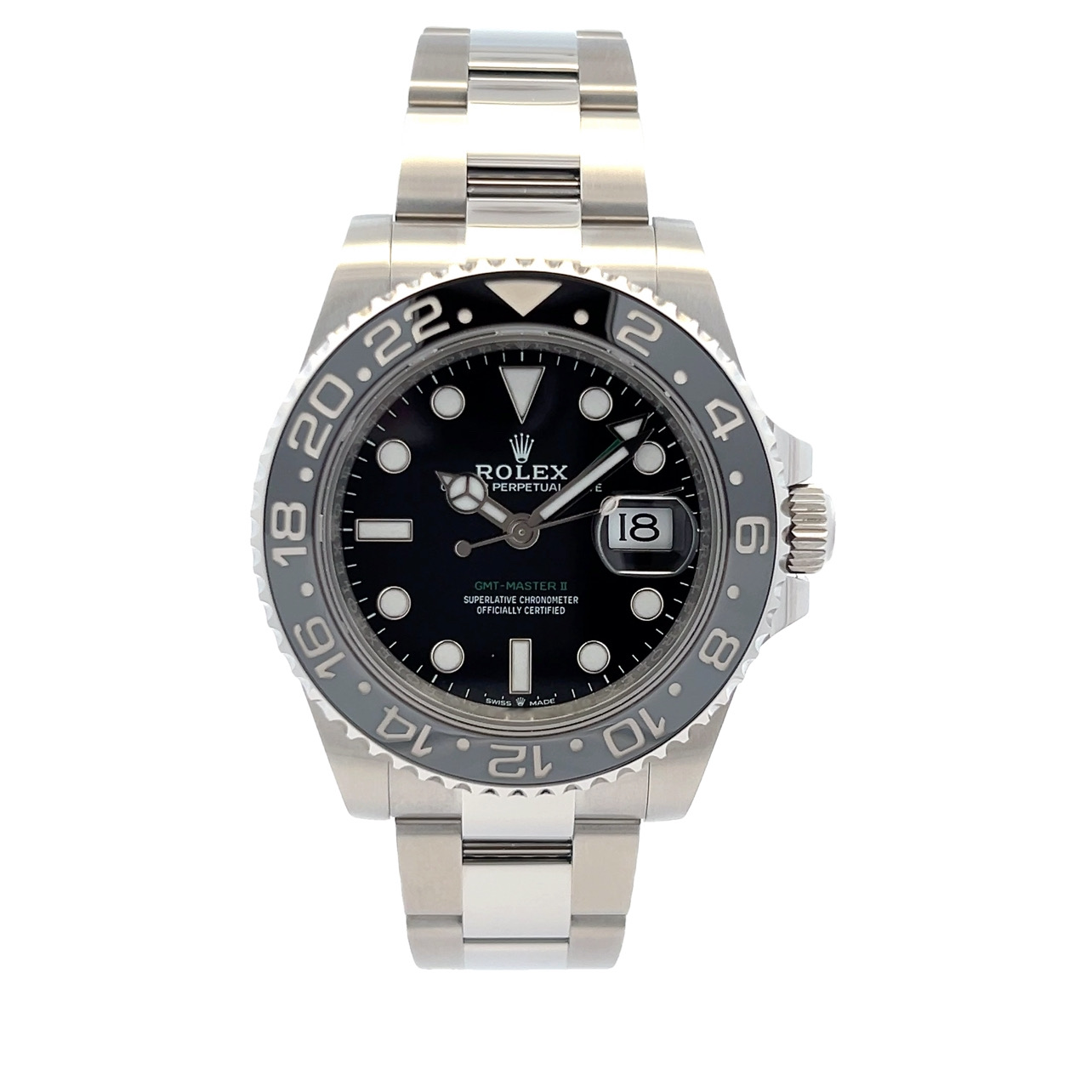 This Rolex GMT Master II 126710 GRNR has a black dial and a bracelet strap. This Rolex has undergone a thorough inspection of water resistance, accuracy, functionality and condition to determine the level of reconditioning required to meet our strict standards. It has also been referenced against technical documents and manufacturer records where available to ensure authenticity and a clean history. Our watches have a 24-month warranty for your peace of mind, in conjunction with any remaining manufacturer’s warranty from new or from service. To maintain the manufacturer’s warranty on this watch, it has not been polished in our service centre.