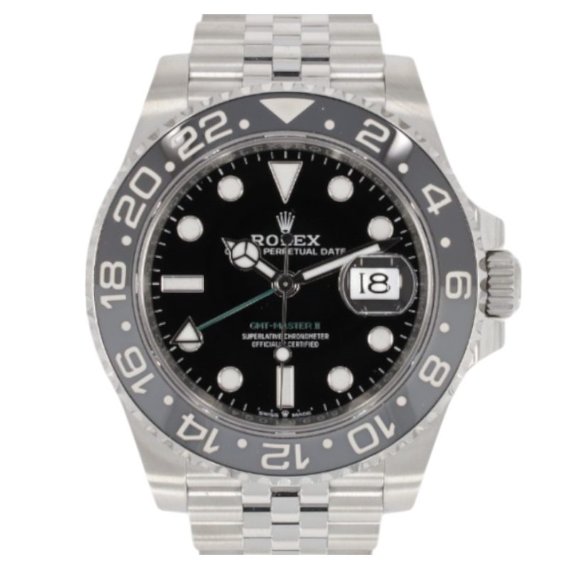 This Rolex GMT Master II 126710 GRNR has a black dial and a bracelet strap. This Rolex has undergone a thorough inspection of water resistance, accuracy, functionality and condition to determine the level of reconditioning required to meet our strict standards. It has also been referenced against technical documents and manufacturer records where available to ensure authenticity and a clean history. Our watches have a 24-month warranty for your peace of mind, in conjunction with any remaining manufacturer’s warranty from new or from service. To maintain the manufacturer’s warranty on this watch, it has not been polished in our service centre.