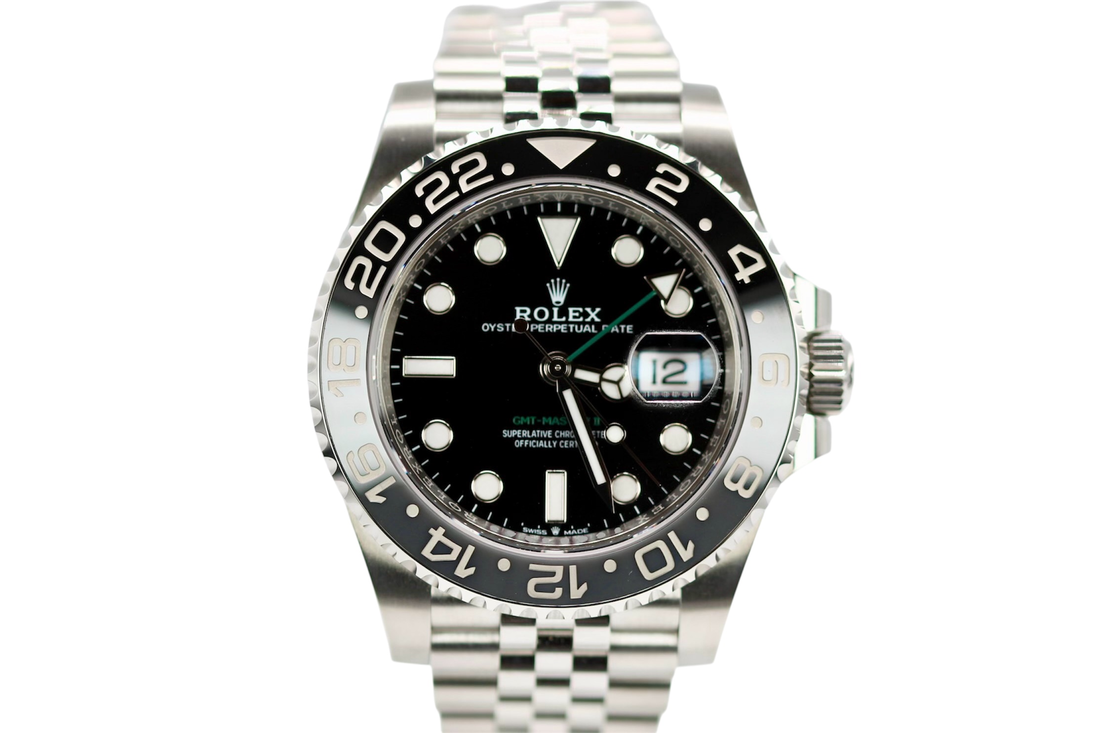 This Rolex GMT Master II 126710 GRNR has a black dial and a bracelet strap. This Rolex has undergone a thorough inspection of water resistance, accuracy, functionality and condition to determine the level of reconditioning required to meet our strict standards. It has also been referenced against technical documents and manufacturer records where available to ensure authenticity and a clean history. Our watches have a 24-month warranty for your peace of mind, in conjunction with any remaining manufacturer’s warranty from new or from service. To maintain the manufacturer’s warranty on this watch, it has not been polished in our service centre.