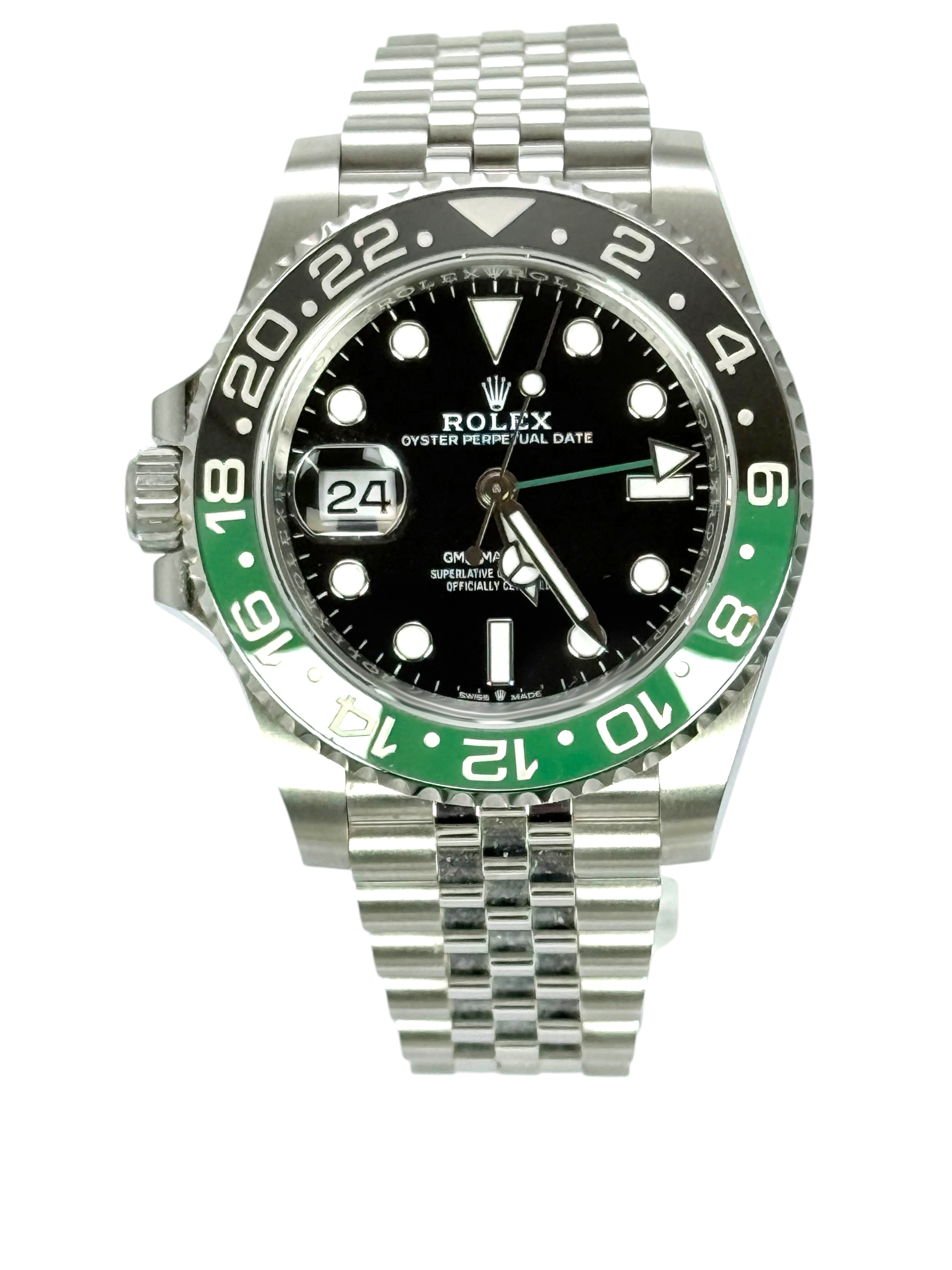 This Rolex GMT Master II 126720 VTNR has a black dial and a bracelet strap. This Rolex has undergone a thorough inspection of water resistance, accuracy, functionality and condition to determine the level of reconditioning required to meet our strict standards. It has also been referenced against technical documents and manufacturer records where available to ensure authenticity and a clean history. Our watches have a 24-month warranty for your peace of mind, in conjunction with any remaining manufacturer’s warranty from new or from service. To maintain the manufacturer’s warranty on this watch, it has not been polished in our service centre.